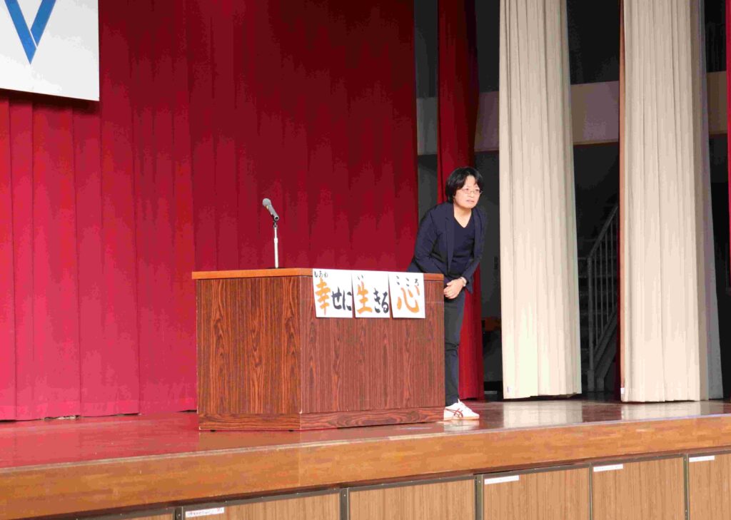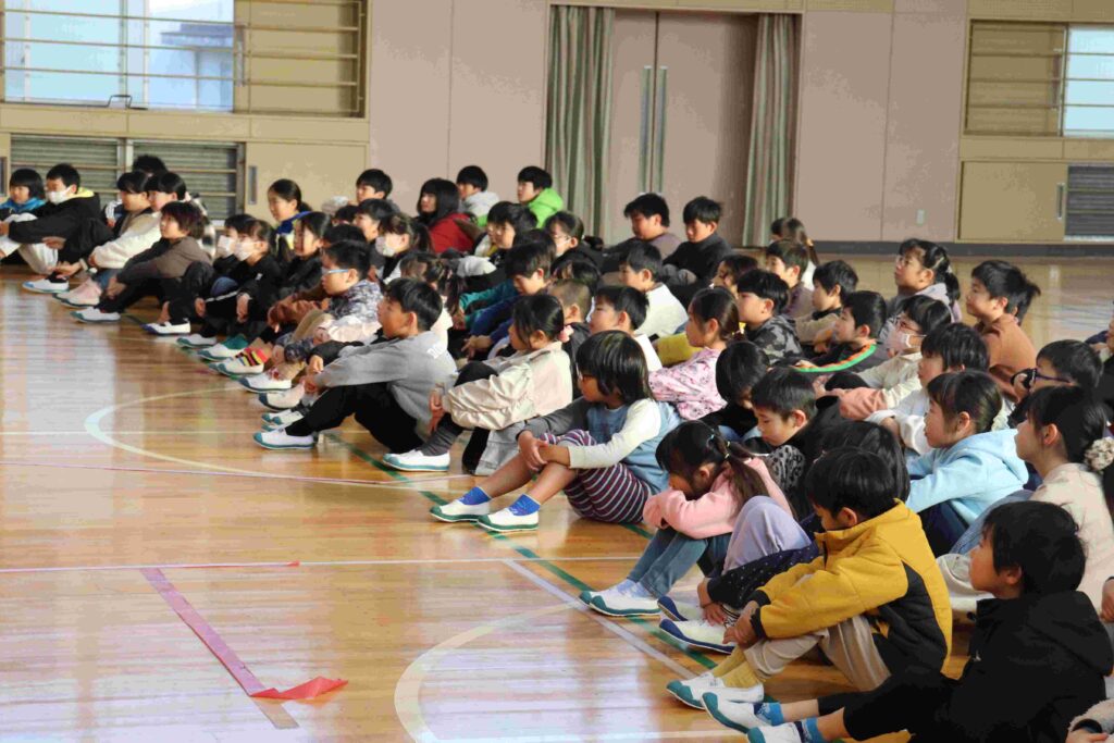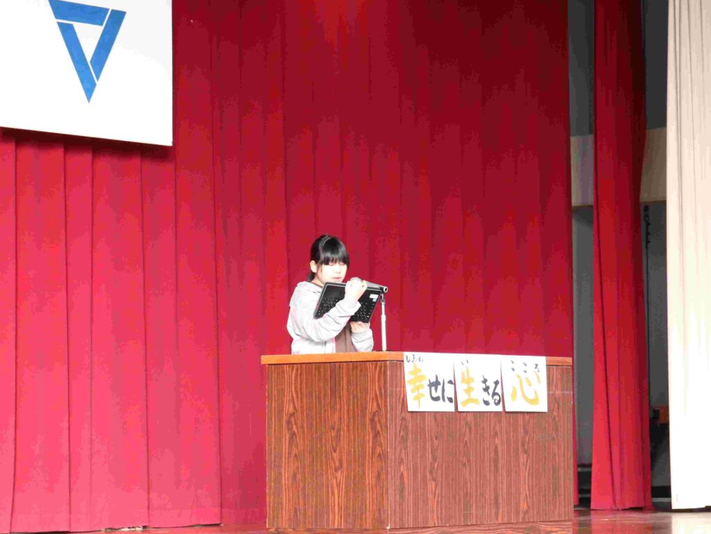 人権週間にちなみ、全校で人権について考えました。今日のお話は「幸せに生きるとは?」からスタート。子どもたちは考えたことを、近くの子や先生と意見交換をしました。それぞれ話している事柄がいろいろと聞こえてきます。すると、校長先生からは「当たり前に過ごすことができること」と話がありました。「当たり前に過ごすことが奪われたら…」そんな悲しいことはありません。「違いがあるから…」と差別や偏見につながったり、脅かされたり、否定されてはいけません。そのことを確認してから、普段の出来事や友達同士の関わりについて振り返りました。言葉や行動を見直すこと、自分事として周りで起きていることを捉え直しました。児童の代表からも「自分だけではなく、周りの人のことも考えて、みんなで生きていくことの大切さ」について話がありました。正しく判断し行動すること、そして「幸せに生きるための心」を育てていくことを全校で約束しました。