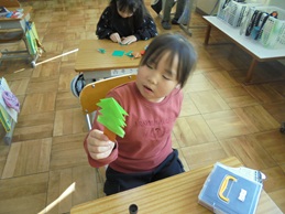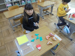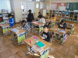 1年生は、クリスマスカードを作っています。カードに貼るクリスマスツリーやサンタ、トナカイを折り紙で作りました。みんな、とても上手です。できたら、いよいよカードに貼って、メッセージを添えて、できあがりです。どんなカードができたかな?