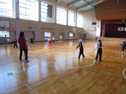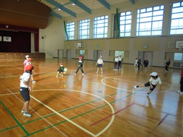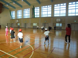 2年生は、体育館でドッジボールです。投げられたボールを受け止めたり、あたらないように逃げたり。全力でドッジボールを楽しんでいます。