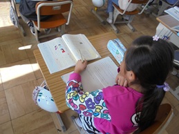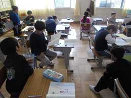3年生は、国語の授業で、自分のおすすめの所を紹介する作文をしています。書き終わったら、発表です。自分のおすすめの所を、「はじめ」「なか」「おわり」「自分の感想」と上手に書くことができていました。