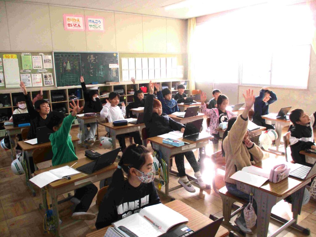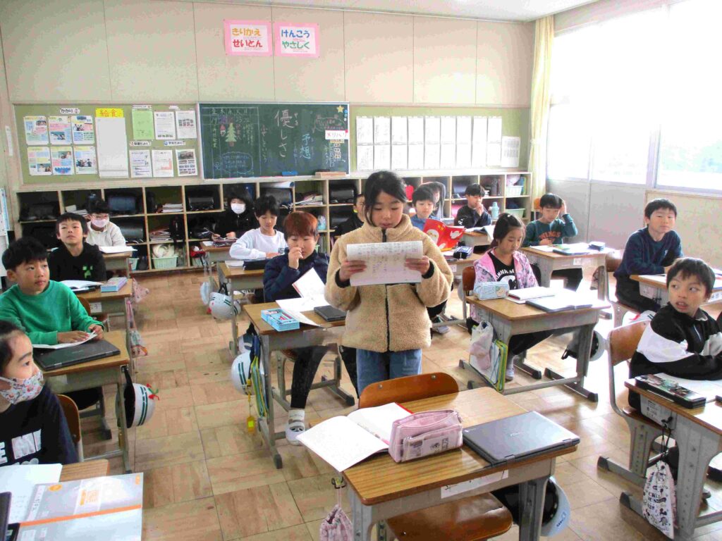 3年生では、国語「はじめ・中・終わりで文を作ろう」の学習成果を披露してくれました。お題は、「布土の特色を伝えよう」です。自ら伝えたいという子がたくさんいました。花、車窓からの景色、店舗、保育園と子どもたちが捉えた自慢の布土を伝えてくれました。布土愛が込められていました。