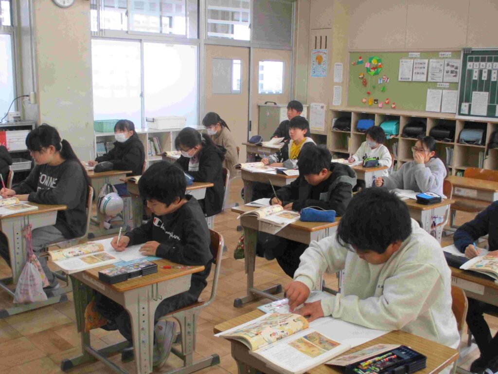 5年生は国語「漢詩を読もう」の授業。先生が「春暁」と黒板に書き入れると「何々?」「春と…」子どもたちは興味津々。漢詩をノートに書き写しながら、「漢字から意味がわかりそう」「?」などいろいろな反応の中、「花落知多少」に「知多が少ないって出てきたよ」とのつぶやきがありました。学級全体が「ふふふ」と思わず楽しい雰囲気に包まれました。五言絶句を味わってくださいね。