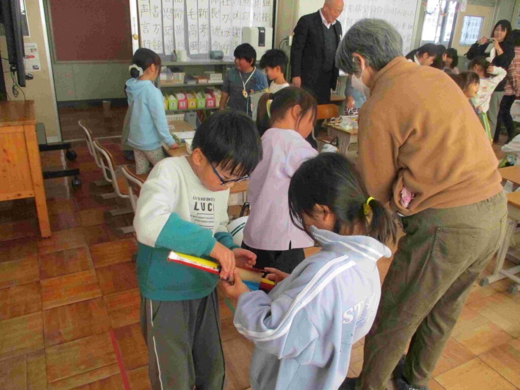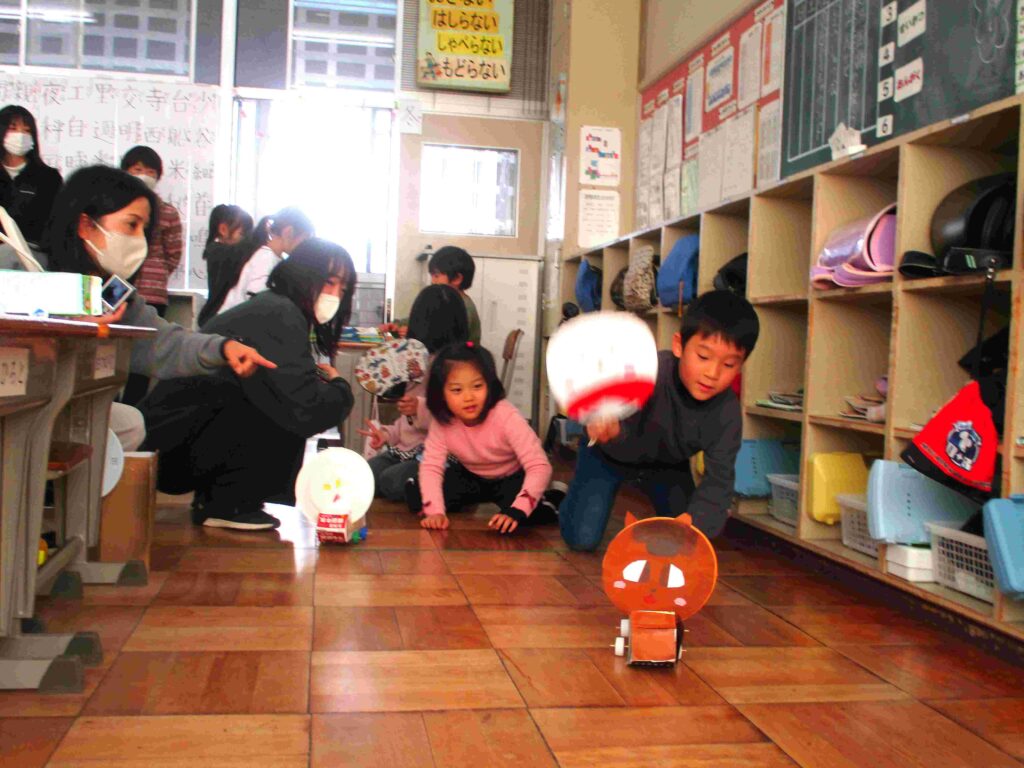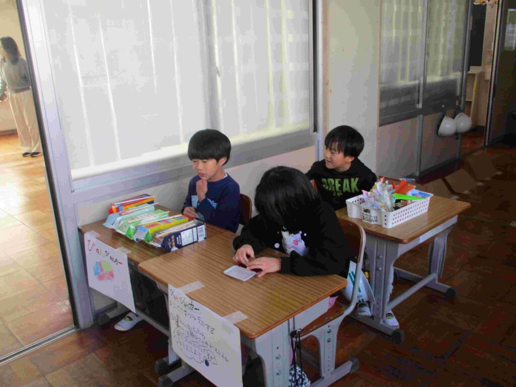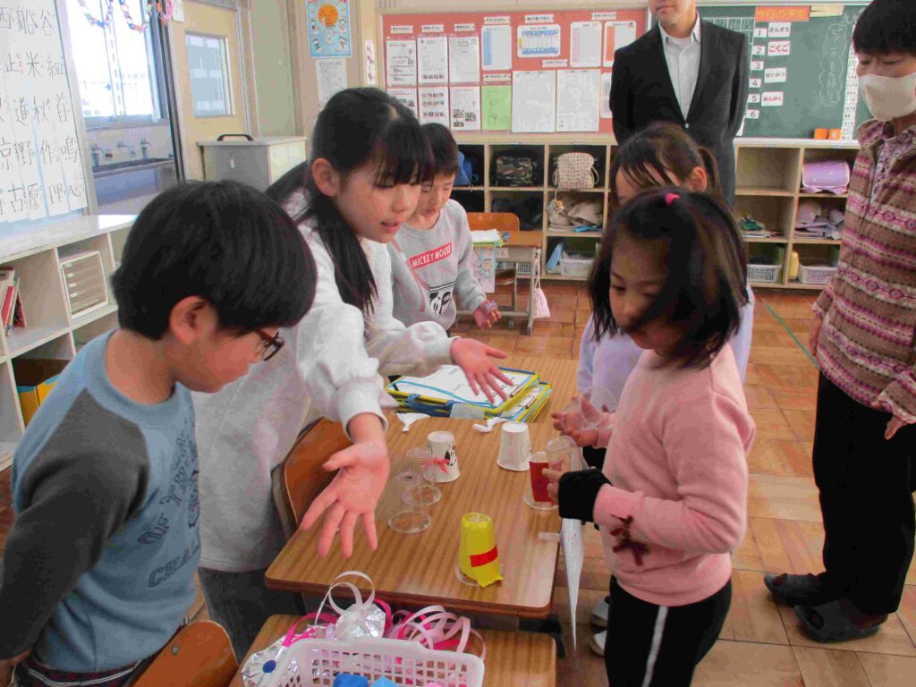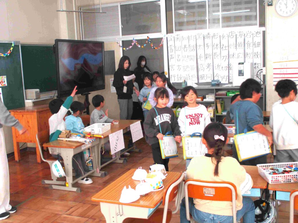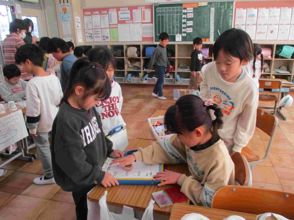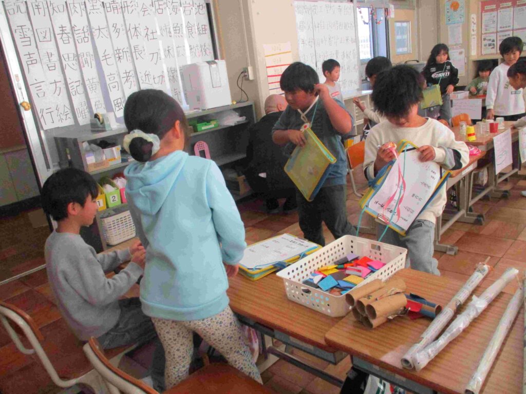 2年生が生活科の学習で身近にある材料でおもちゃを作りました。そのおもちゃを利用し、1年生を招待して「おもちゃランド」を開催しました。風やゴムの力を利用したおもちゃは1年生に大人気。1年生に遊び方を教えたり、「すごい!」「おしい!もう1回!」と温かな声をかけていました。1年生をリードする姿がとてもすばらしかったです。誇らしげな表情の2年生でした。