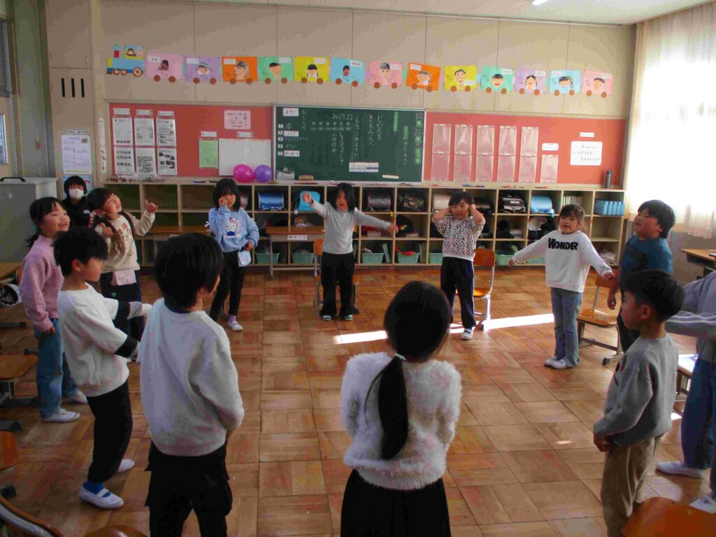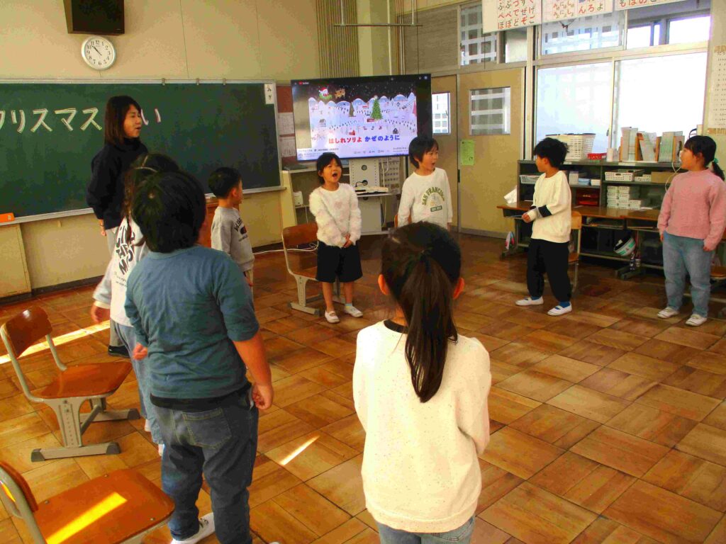 1年生はクリスマス会をして楽しみました。体でリズムをとり、元気にジングルベルを歌った後は、クリスマスカードの交換。ワクワクがいっぱい詰まった会でした。
