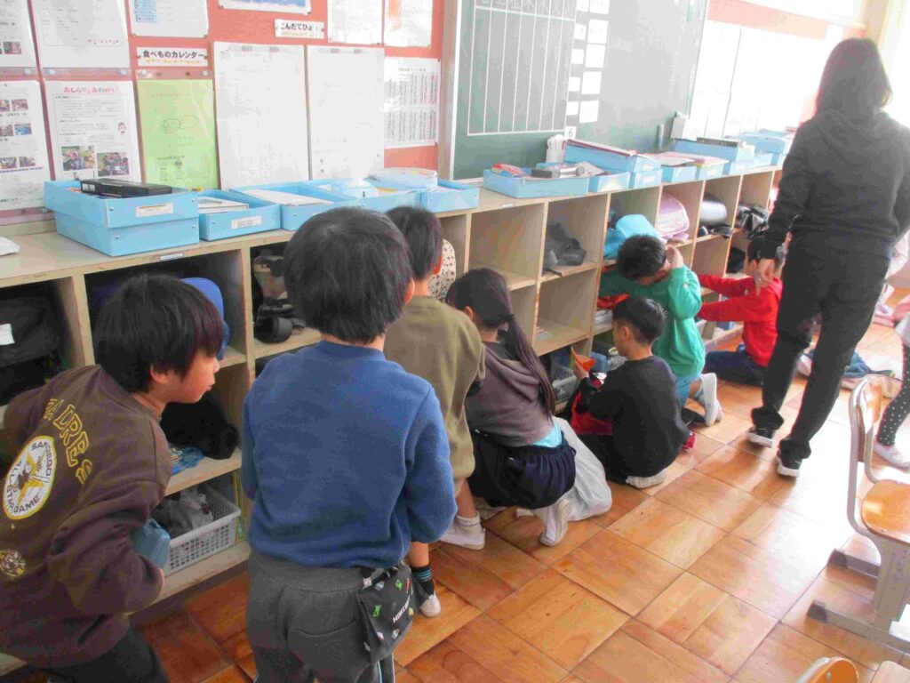 2年生は、身の回りの整理・整頓をしていました。机の中にある教科書や補助教材を順番に確かめて、揃えてから後ろのロッカーへ入れていました。机の中もきれいになりました。