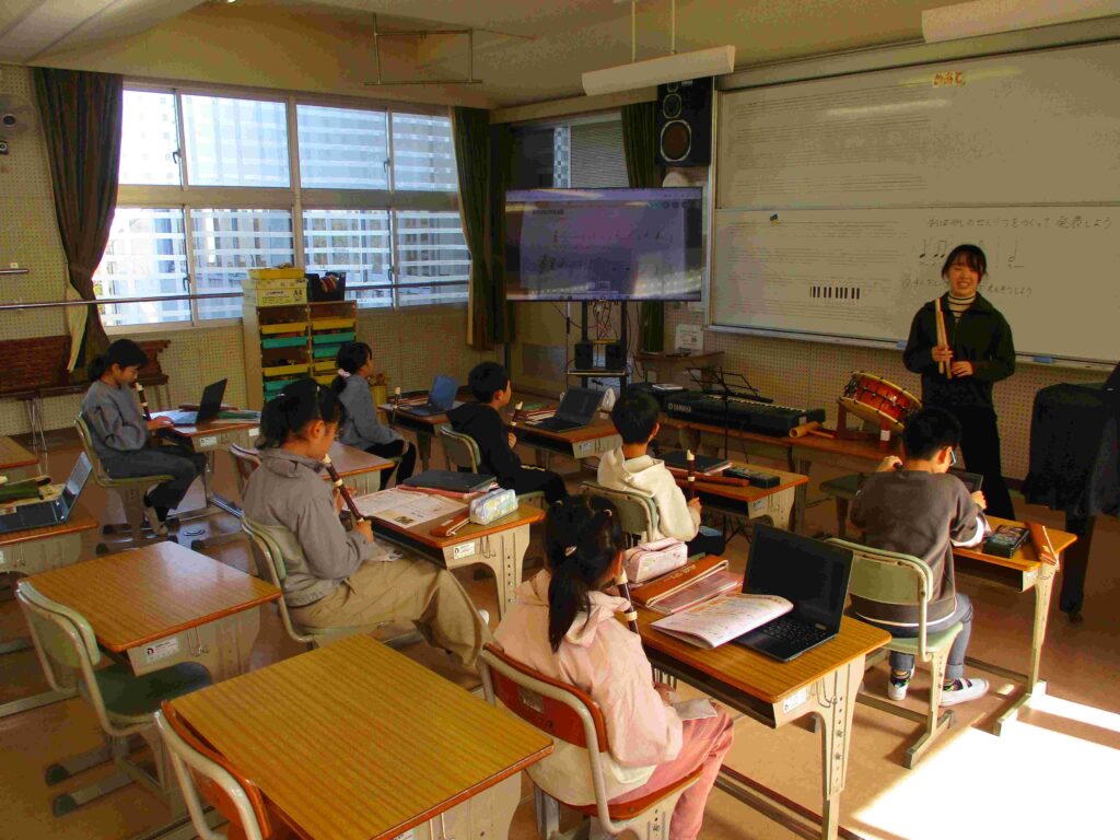 4年生は音楽、「自分で作ったお囃子をリコーダーで演奏しよう」です。先生の締太鼓に合わせてオリジナルお囃子を順番に演奏しました。