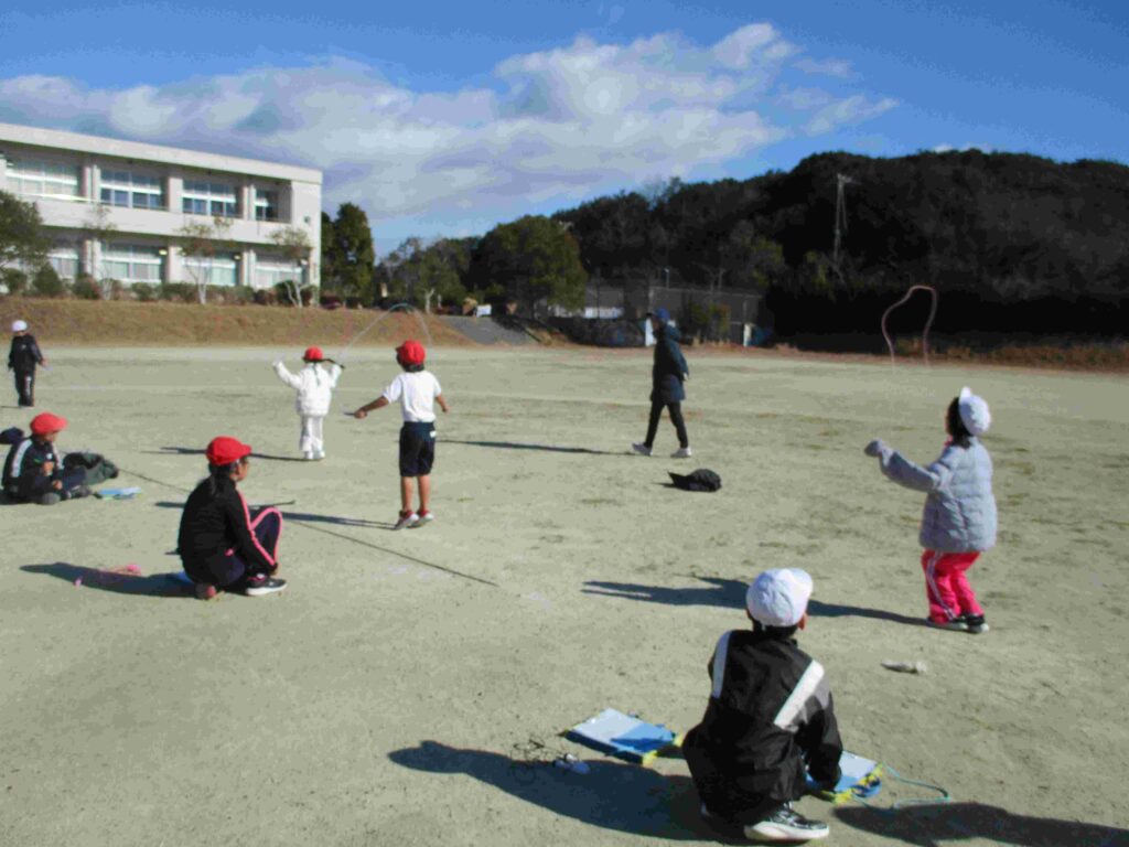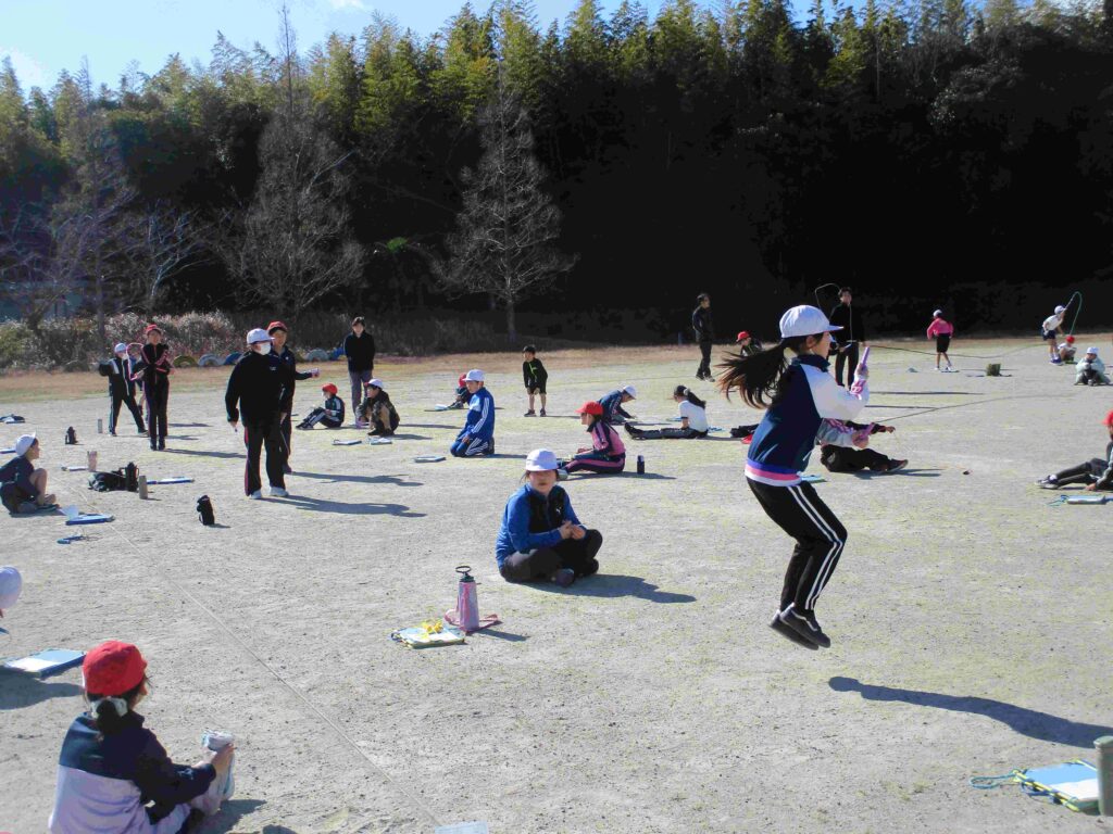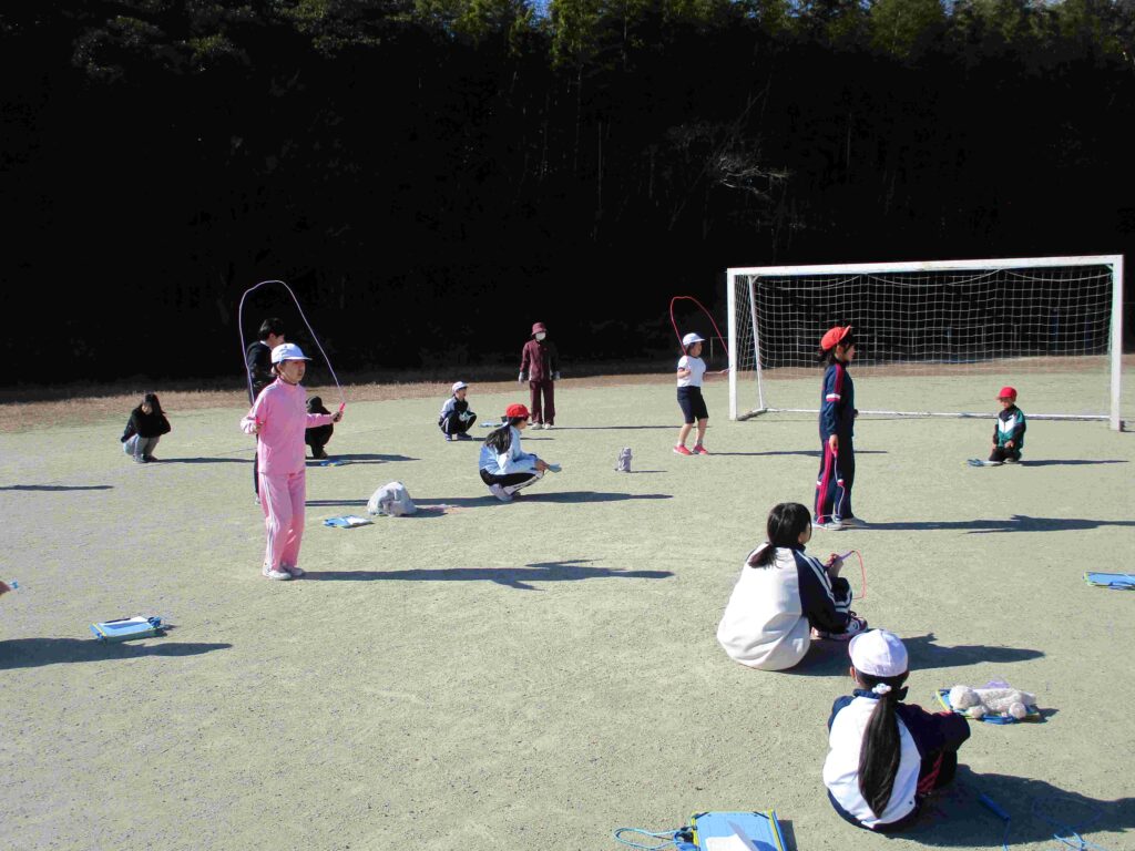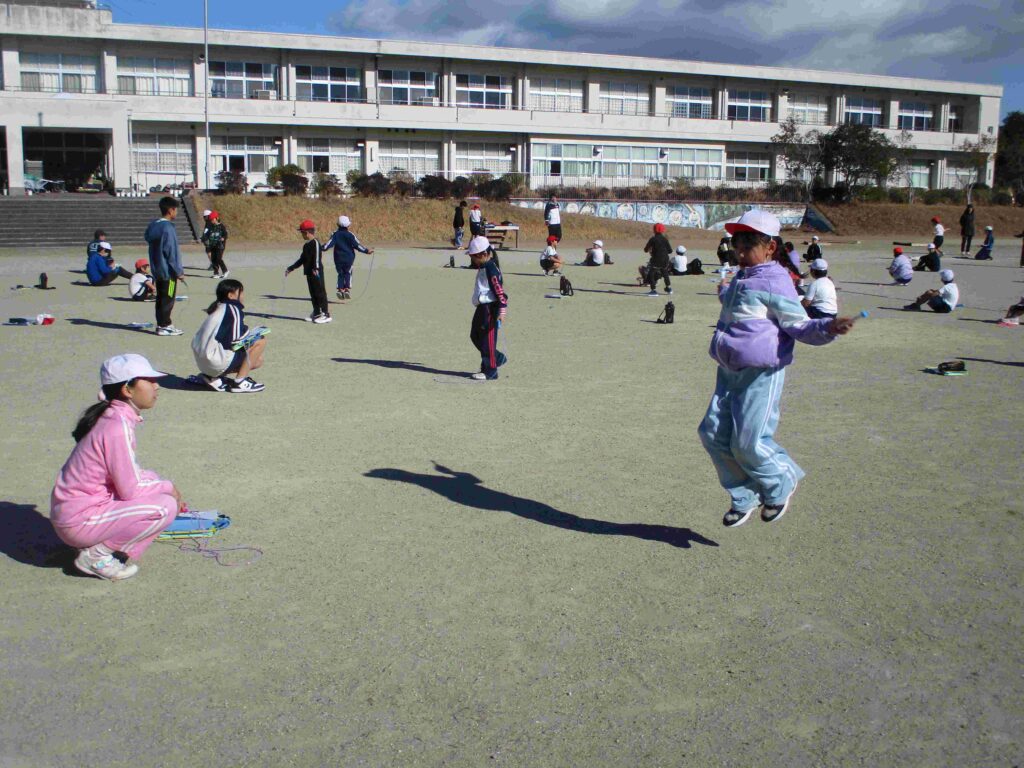 今日はなわとび週間の最終日。日頃の練習の成果を発揮するなわとび大会を開催しました。検定表に示された各技の合格回数を目指し、レッツ トライ!縄を足にひかけても何度もやっていくうちにできるようになる子がたくさんいました。また、回数を数えたり、応援をしたりと見守る子の支えもすばらしかったです。本当によくがんばりました。