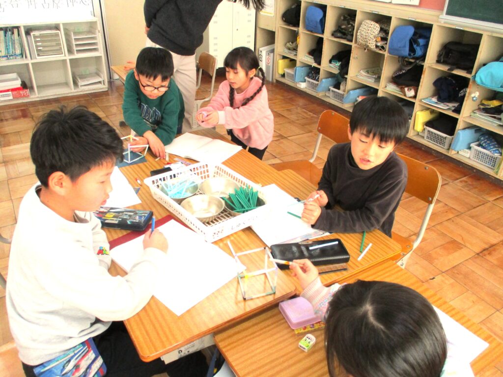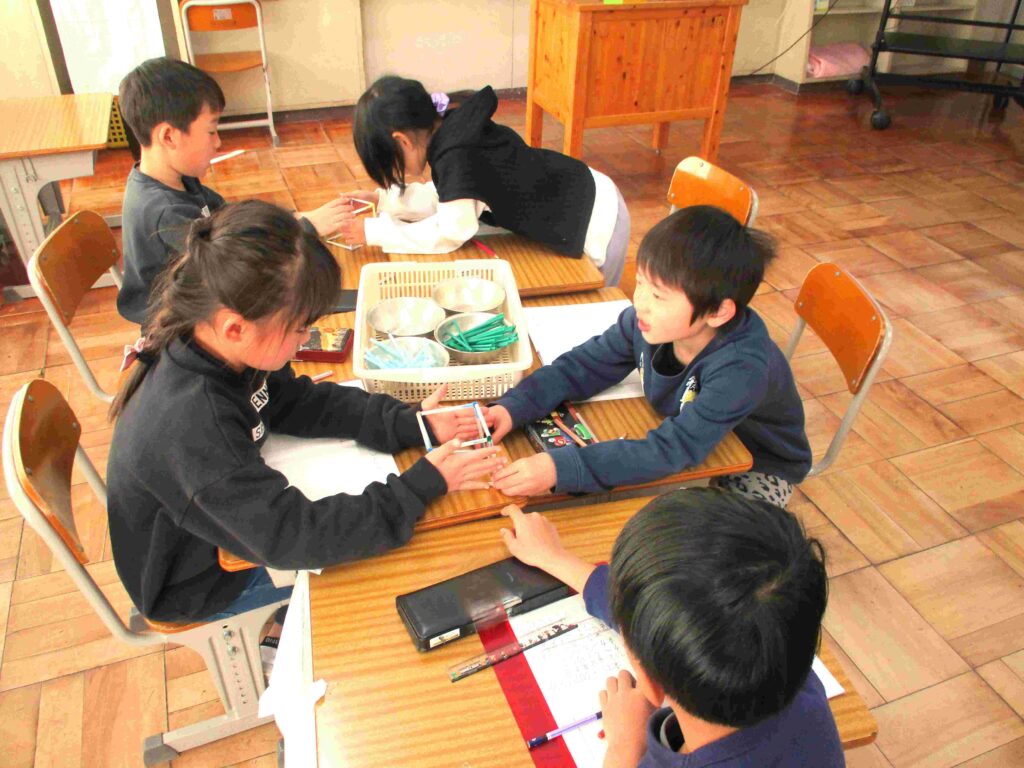 2年生算数では立体の学習をしていました。ストローやモールを使って立方体作りです。2年生では、辺や頂点、正方形、長方形と形に関する用語を学習してきました。「辺(ストロー)は12本」「モールは…?」と話していました。
