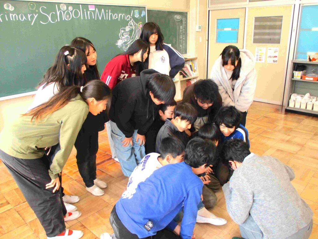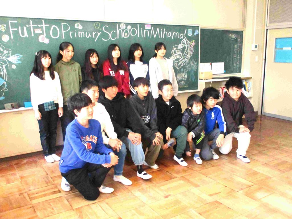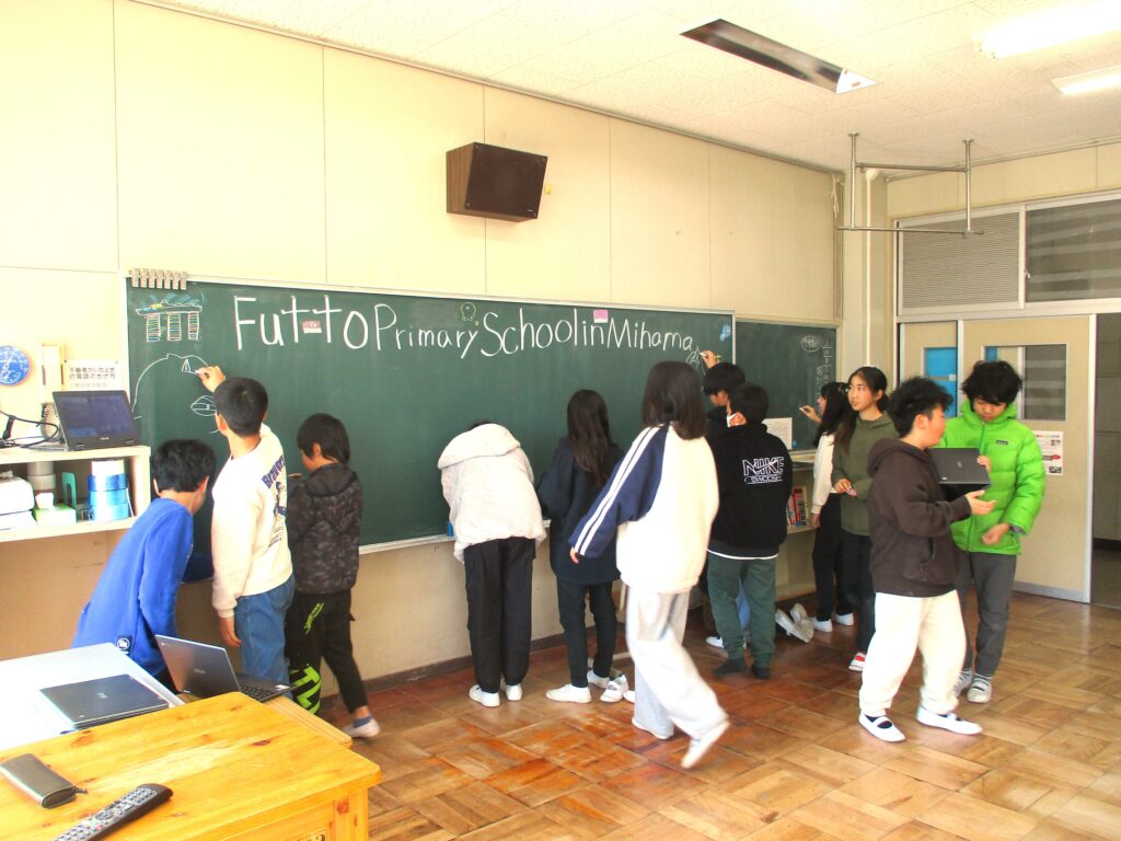 6年生は交流のあるベドックグリーン小学校(シンガポール)へ開校25周年をお祝いするビデオメッセージの収録をしていました。黒板にイラストを描き、メッセージのリハーサルを行い準備はOK。6年生の思いを伝えました。役場から来校された方からお褒めの言葉をいただきました。