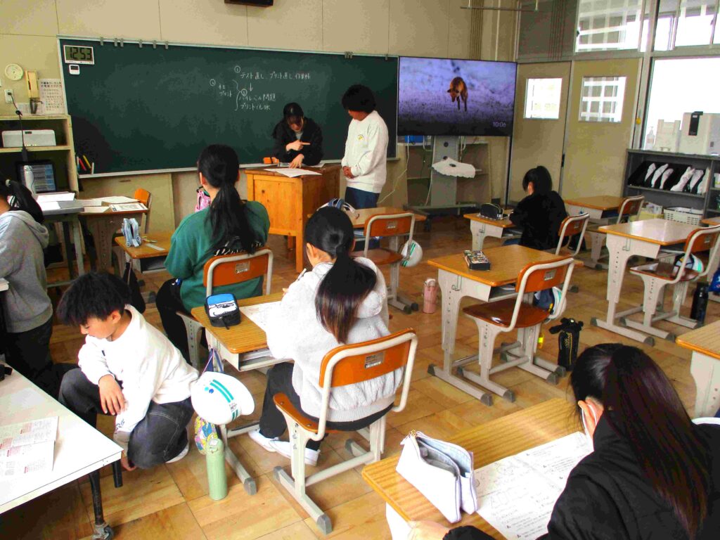 5年生は算数、テスト直しや新たな問題に取り組んでいました。解き方を友達と教え合ったり、自分で解いたりしていました。