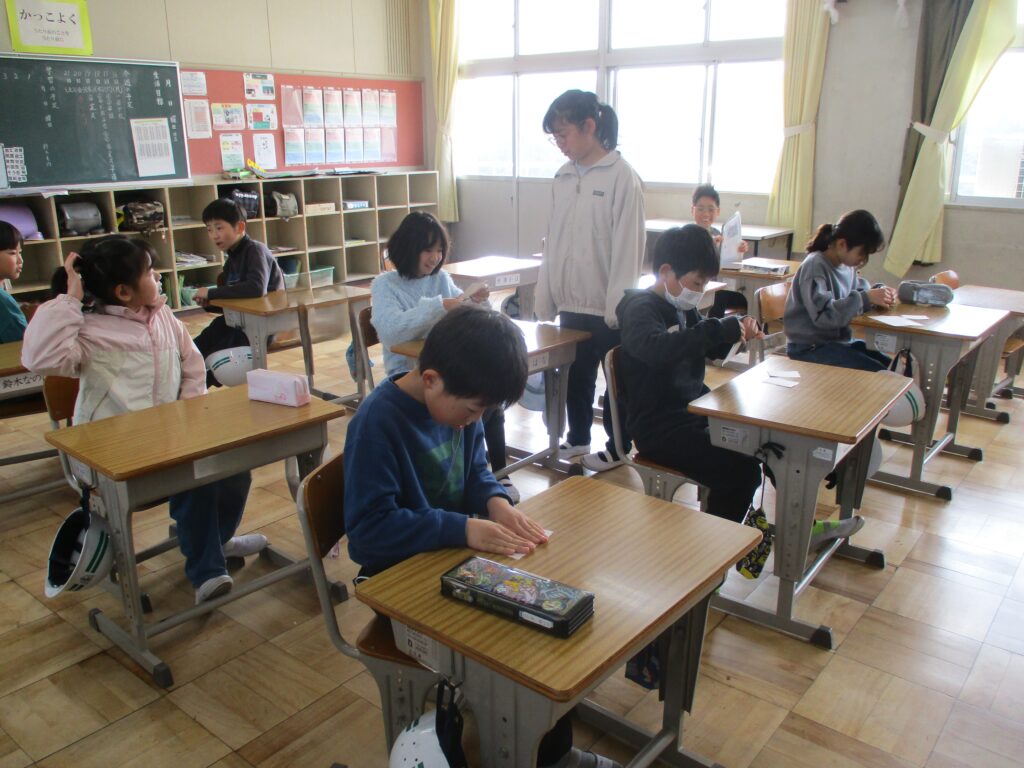 4年生はくじをつくっていました。紙に折り目を付けて手で裂いて…。何のくじ引きかな。