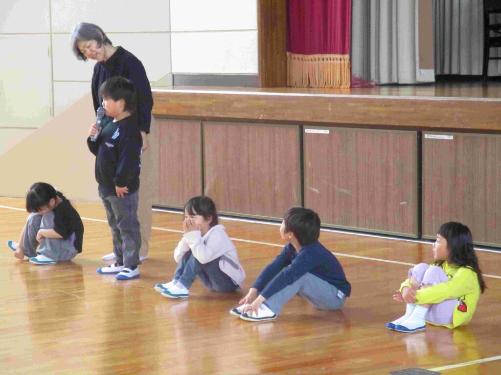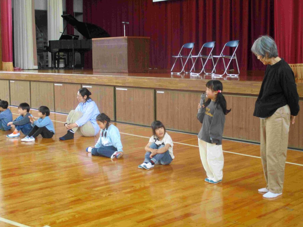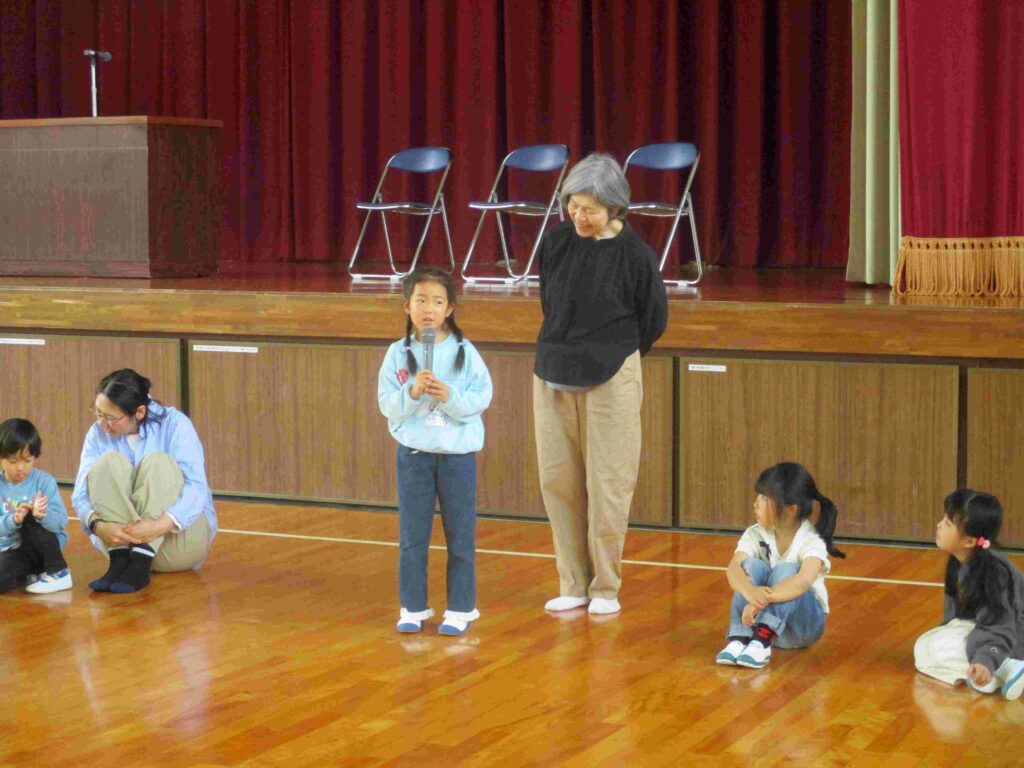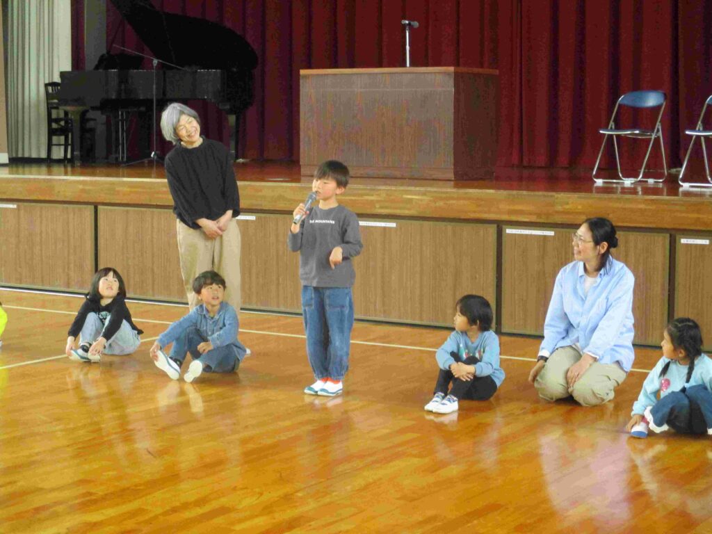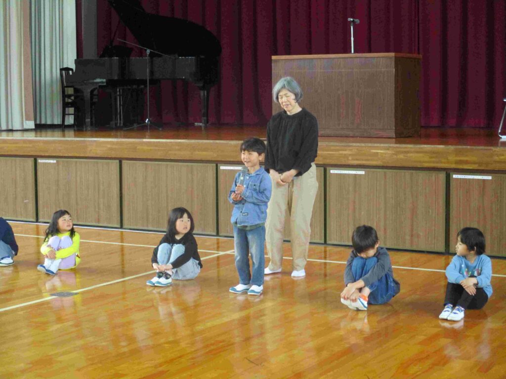 ずらりと並んだ1年生。何が始まるかと思いきや、マイクを持って自己紹介を始めました。「わたしの名前は〇〇です」「好きな食べ物は(遊びは)〇〇です」「よろしくお願いします」としっかり言えていました。広くて大きな体育館ではちょっぴり緊張した様子でしたが最後の友達の自己紹介が終わるまで静かに待つことができました。本番が楽しみです。