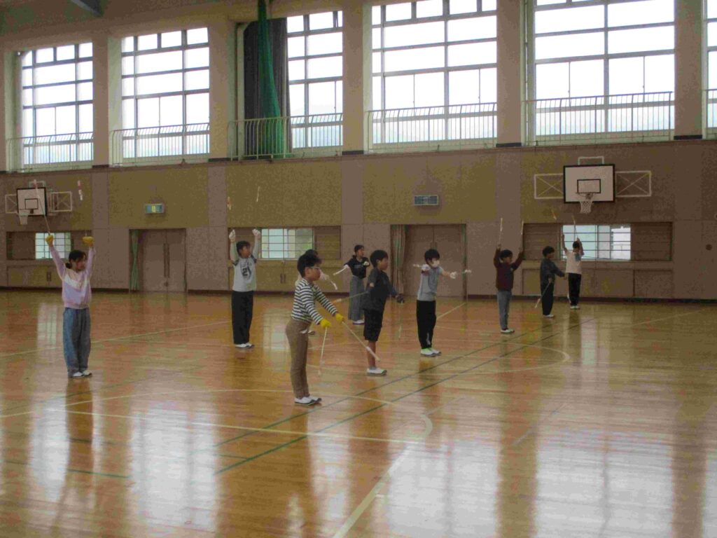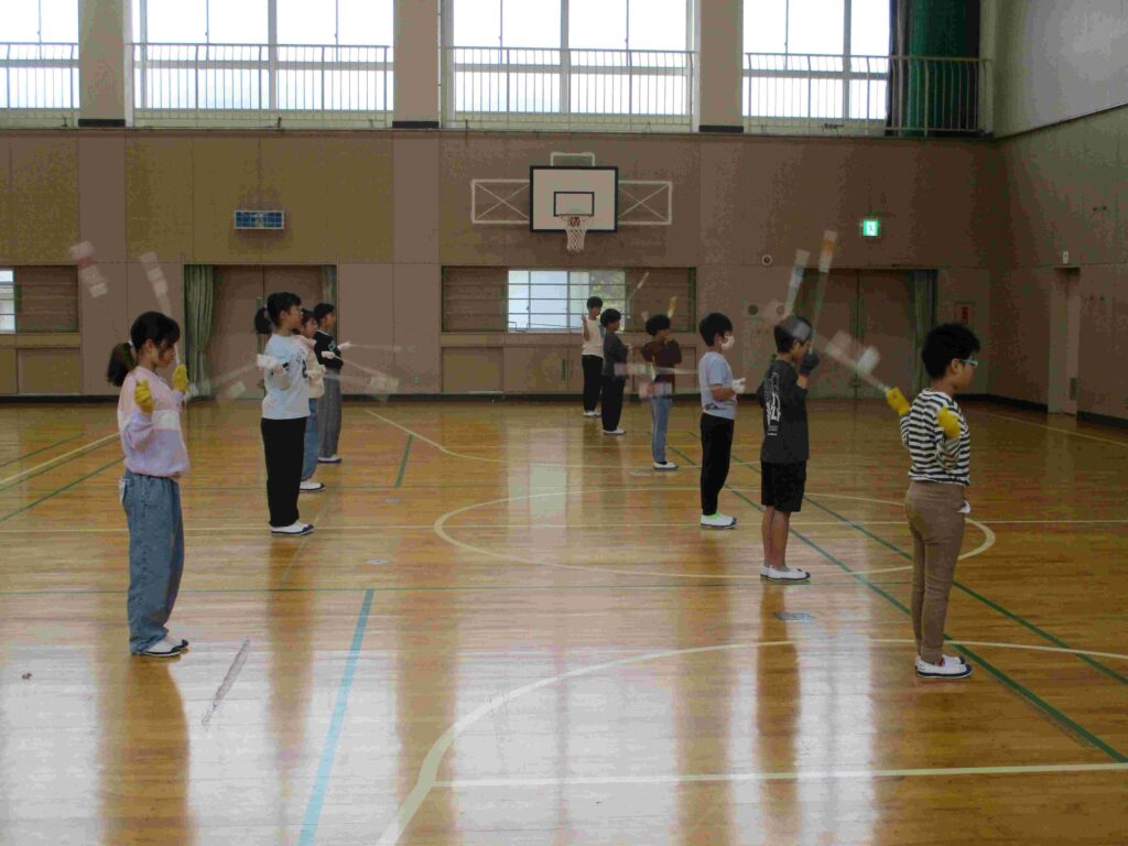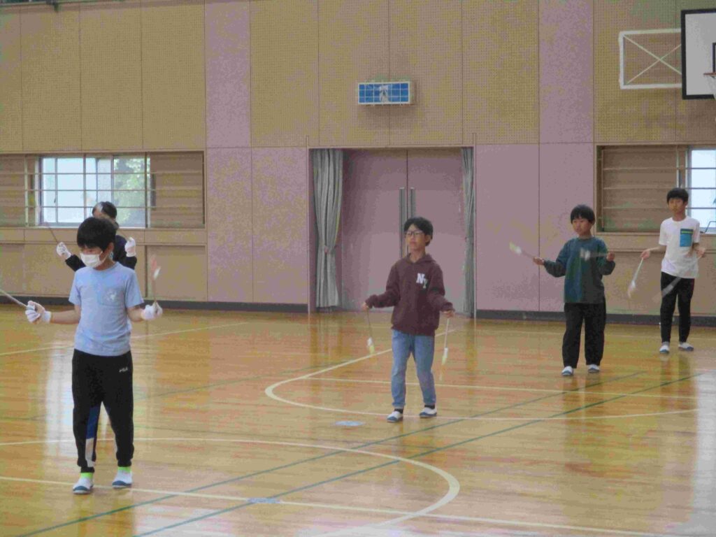 5年生は、聴力検査後の時間、体育館でトーチワークの練習をしました。前回よりも手首の力が抜けてトーチを大きく振ることができていました。