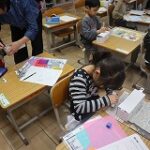 図工の授業では、スルスル糸をすべる作品をつくりました。 キラキラ光る折り紙や和紙を使って、素敵な作品に仕上がりそうです。