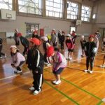 体育の授業では、けんけんやスキップなどで体を動かしたり、手押し相撲でバランスをとったりする運動をしました。