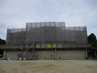 体育館壁面工事の様子、5年総合(防災教育)の様子です。