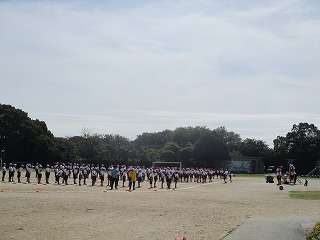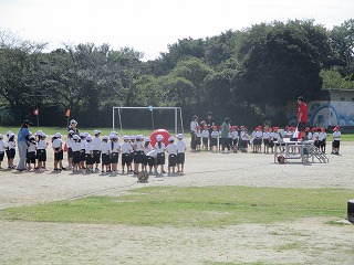 運動会の練習を元気よく行っていました。写真は、1年生と5,6年生合同練習の様子です。