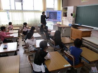 写真は、1年生の外国語 と 4年生のスポーツテスト の様子です。