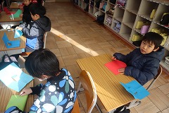 1年生「クリスマスカード作り(1組)」 2025/12/04 学校の様子, 1年 図工の授業では、クリスマスパーティーに向けて友達に渡すカード作りをしました。 おりがみやクーピーを使って、もらってうれしいカードを作れるようにがんばりました。