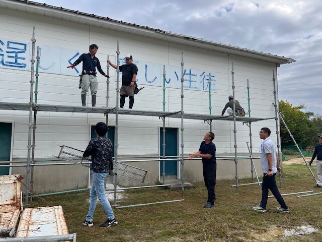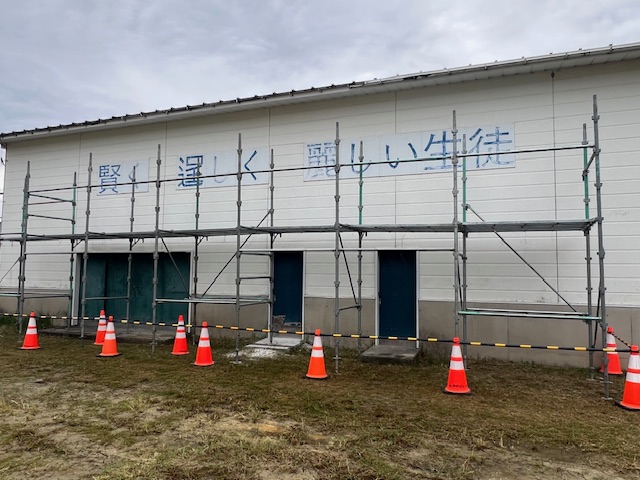 クラブハウスに掲げてある、河和中が目指す生徒「賢く 逞しく 麗しい生徒」の文字が薄くなってきたこともあり、保護者の皆さまで、きれいに塗り直してくださることになりました。本日は、文字を塗るための足場作りをしてくださいました。土曜日にも関わらず、多くの方が作業をしてくださいました。ありがとうございます。文字がきれいになることが楽しみです。