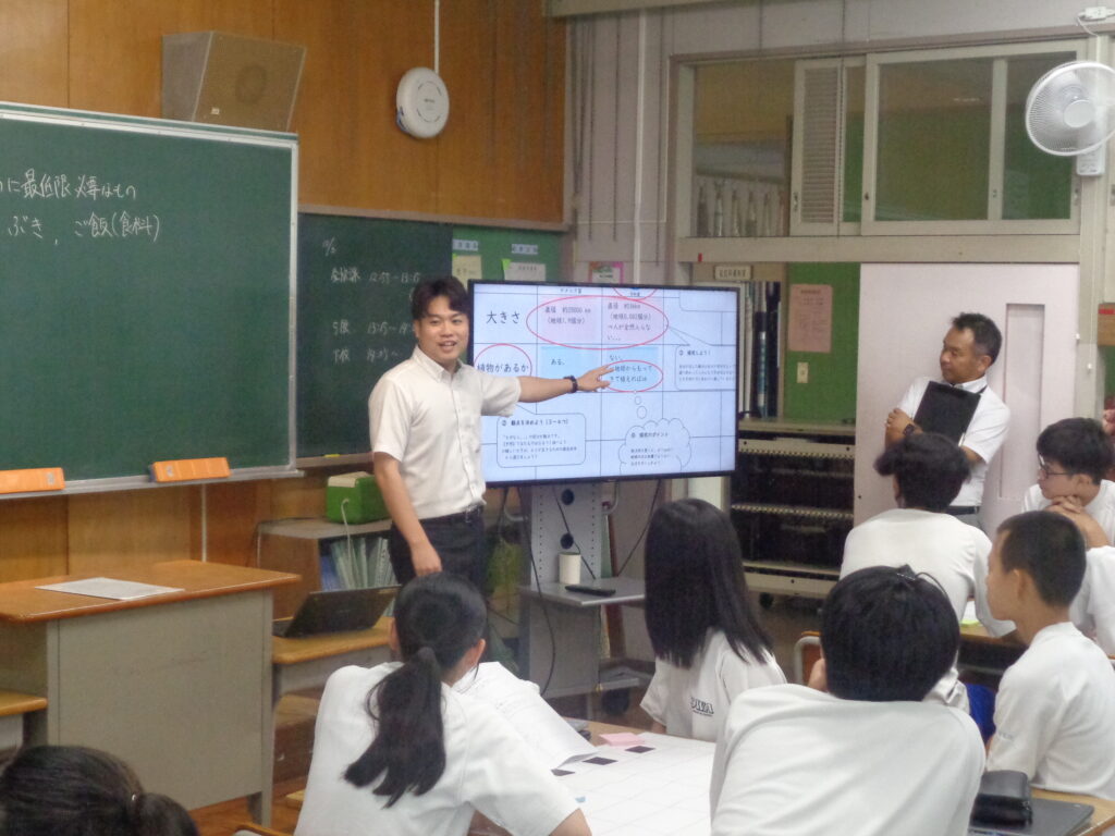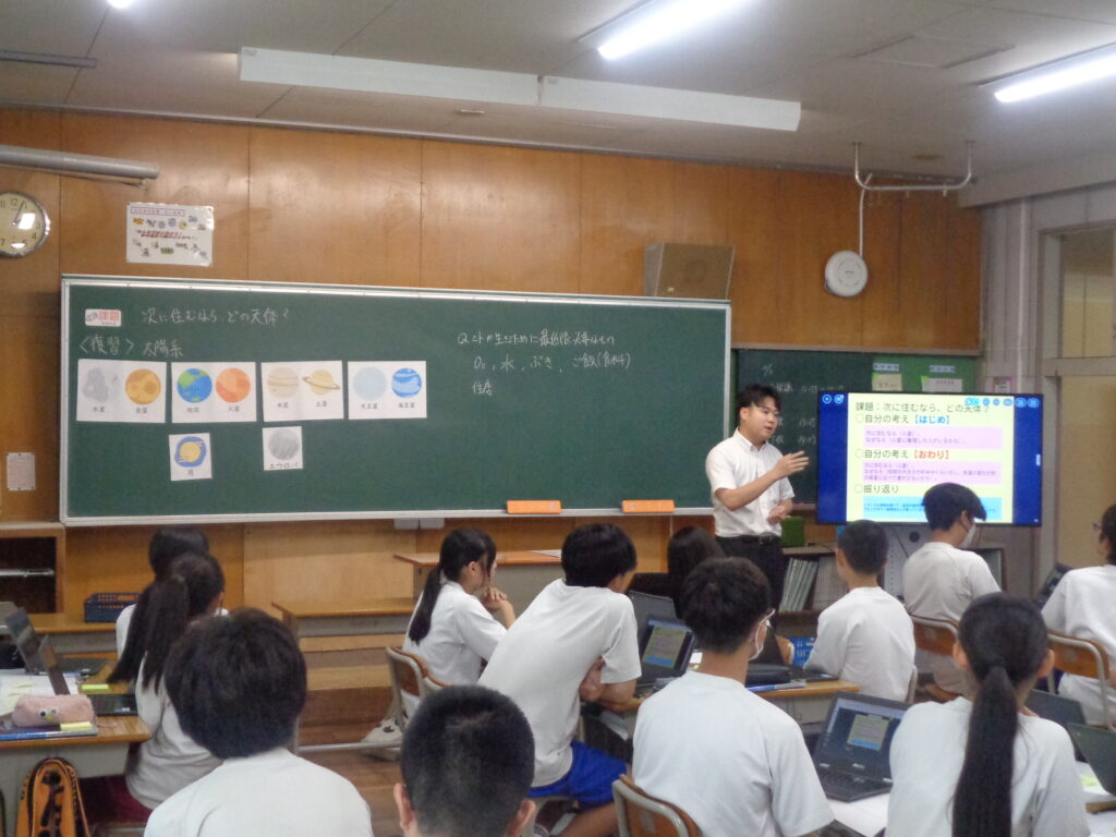 研究授業が行われました。3年生の理科の授業で「次に住むならどの天体?」という課題に取り組みました。生徒たちは、これまで学んだことを生かして予想を立て、グループで学び合いながら、住むのに適した天体を探究しました。個の予想からグループでの学び合い、全体での共有を通して、自分なりの納得解・最適解を見つけることができました。「学び合う」ことのよさを実感できた授業でした。
