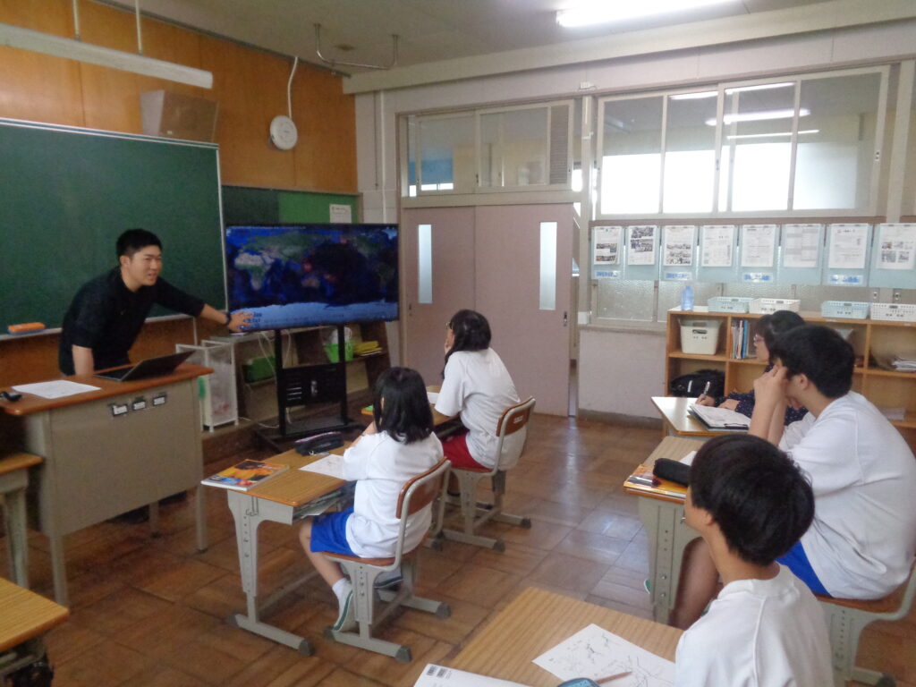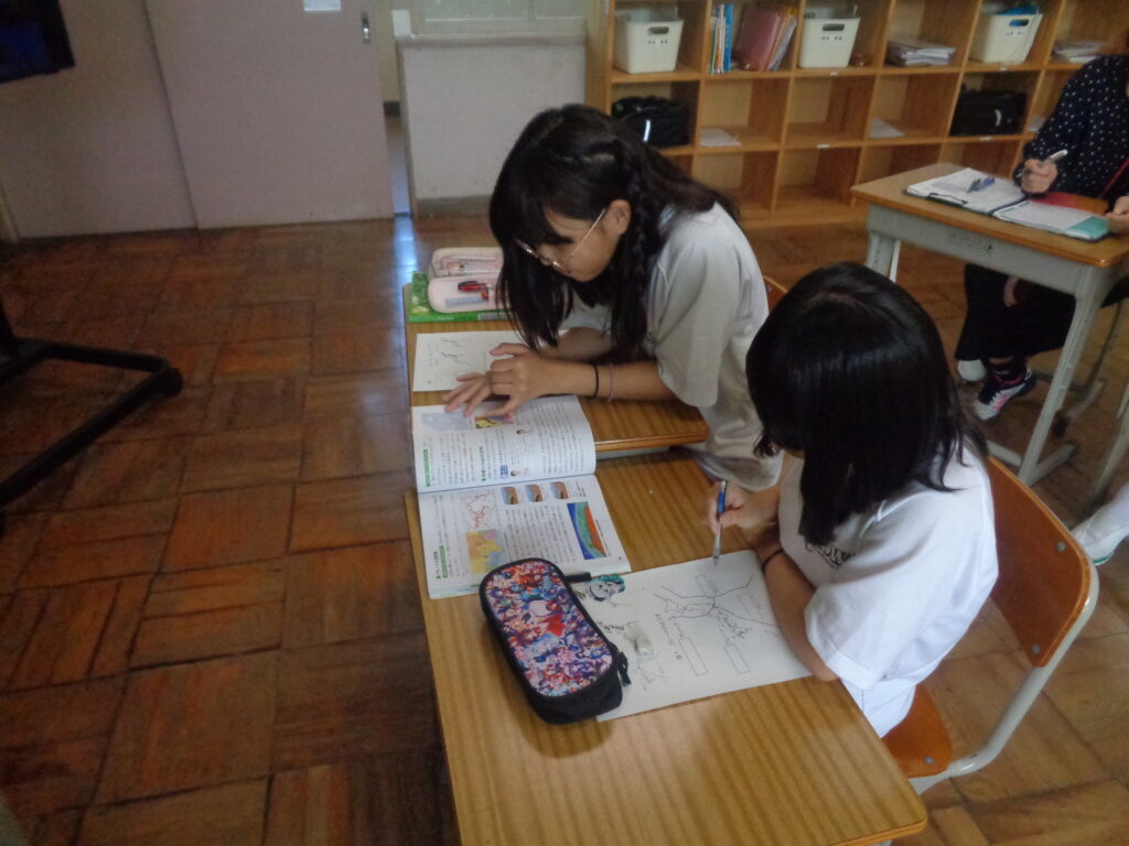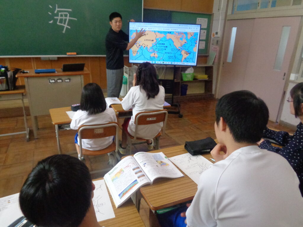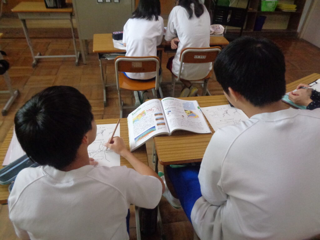 理科の学習の様子です。前回の学習では「火山」について学び、日本の地下にはマグマがあることや、火山活動が活発であることを知りました。今日はその学びをもとに、「日本に地震が多いのはなぜだろう?」という新しい課題に取り組みました。子どもたちは地図を見ながら、日本のまわりに4つのプレートが集まっていることを確認しました。「プレートがぶつかる場所で地震が起きるんだ!」という気付につながり、地震が多い理由をつきとめることができました。