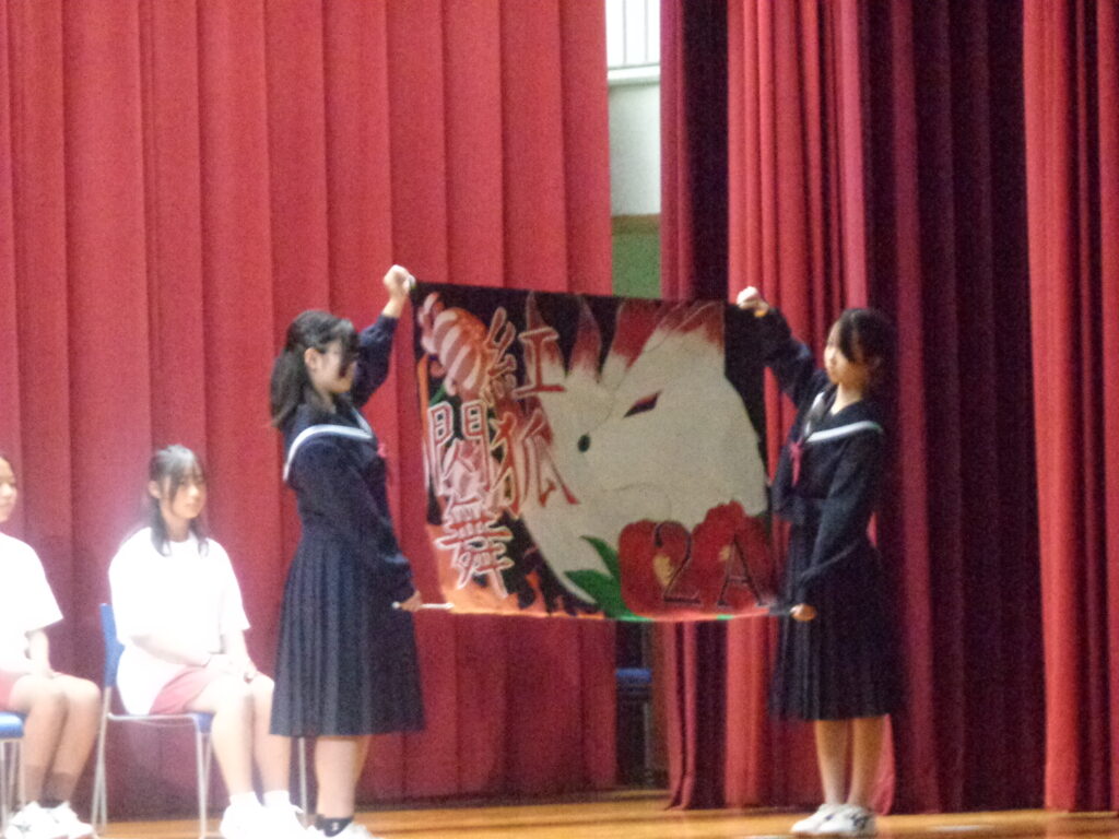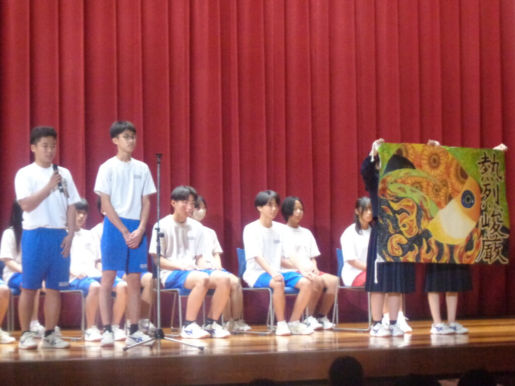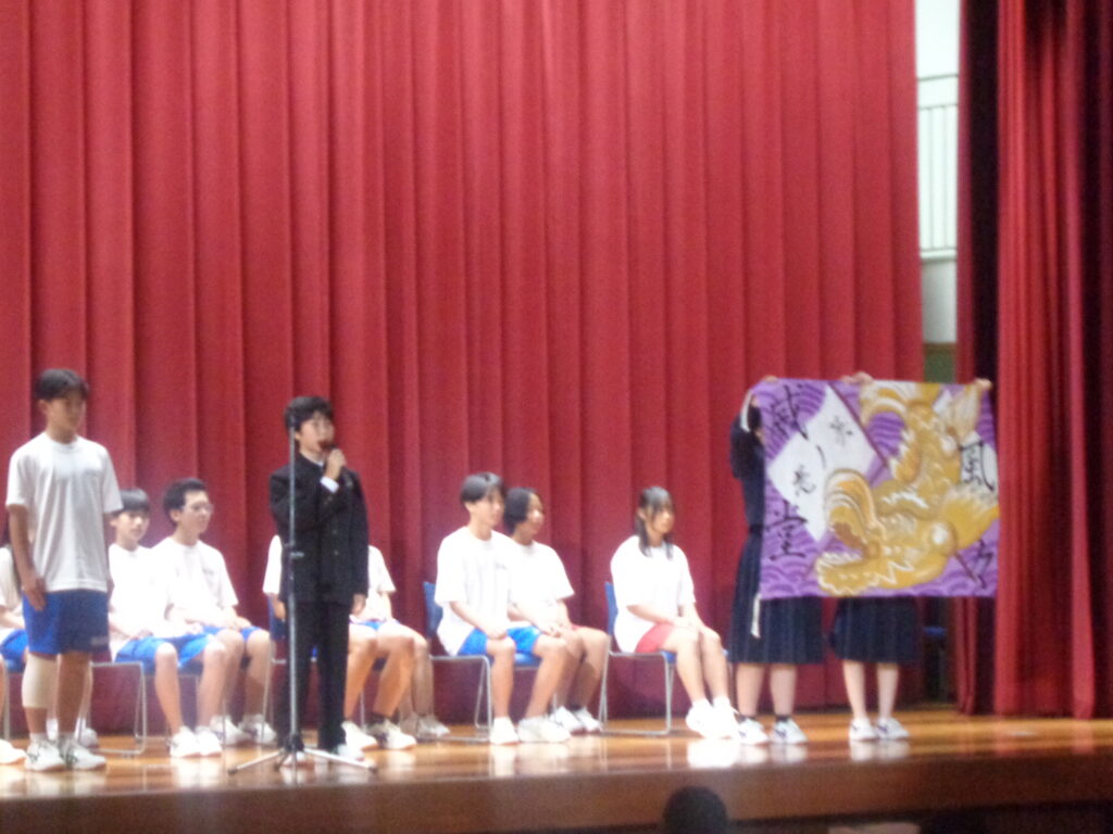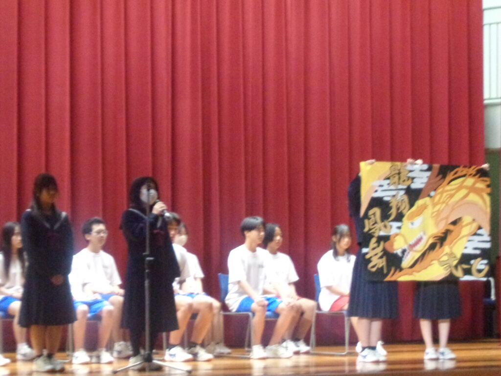 学級旗に込めた想いや応援合戦に込めた想いを旗長と団長が発表していきました。学級旗は、それぞれが工夫を凝らしていて見応えがあります。また、明日ゆっくりと見てあげてください。