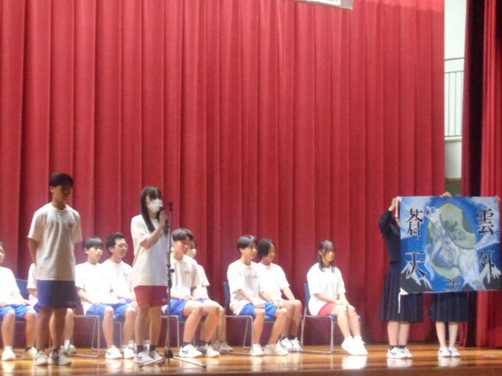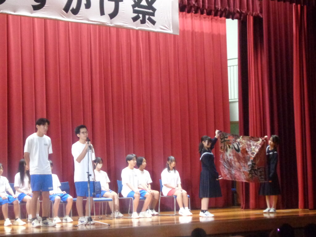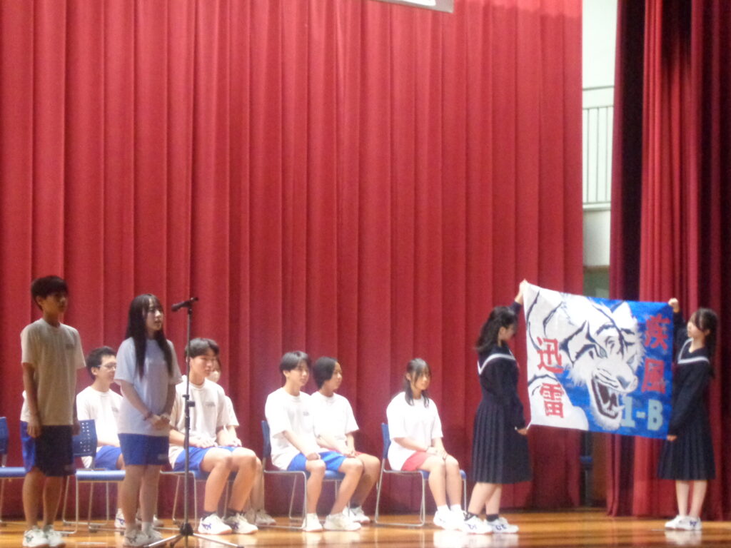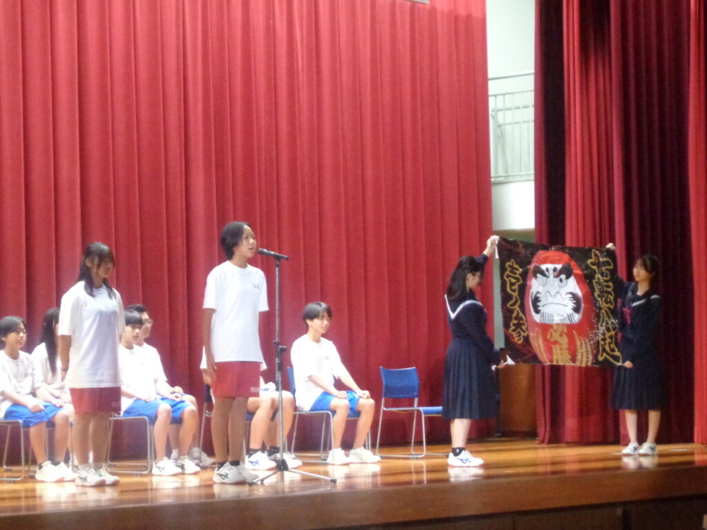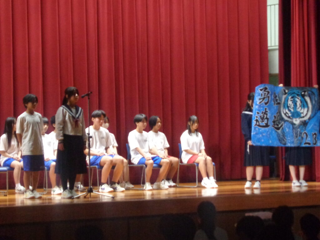 学級旗に込めた想いや応援合戦に込めた想いを旗長と団長が発表していきました。学級旗は、それぞれが工夫を凝らしていて見応えがあります。また、明日ゆっくりと見てあげてください。