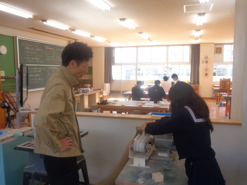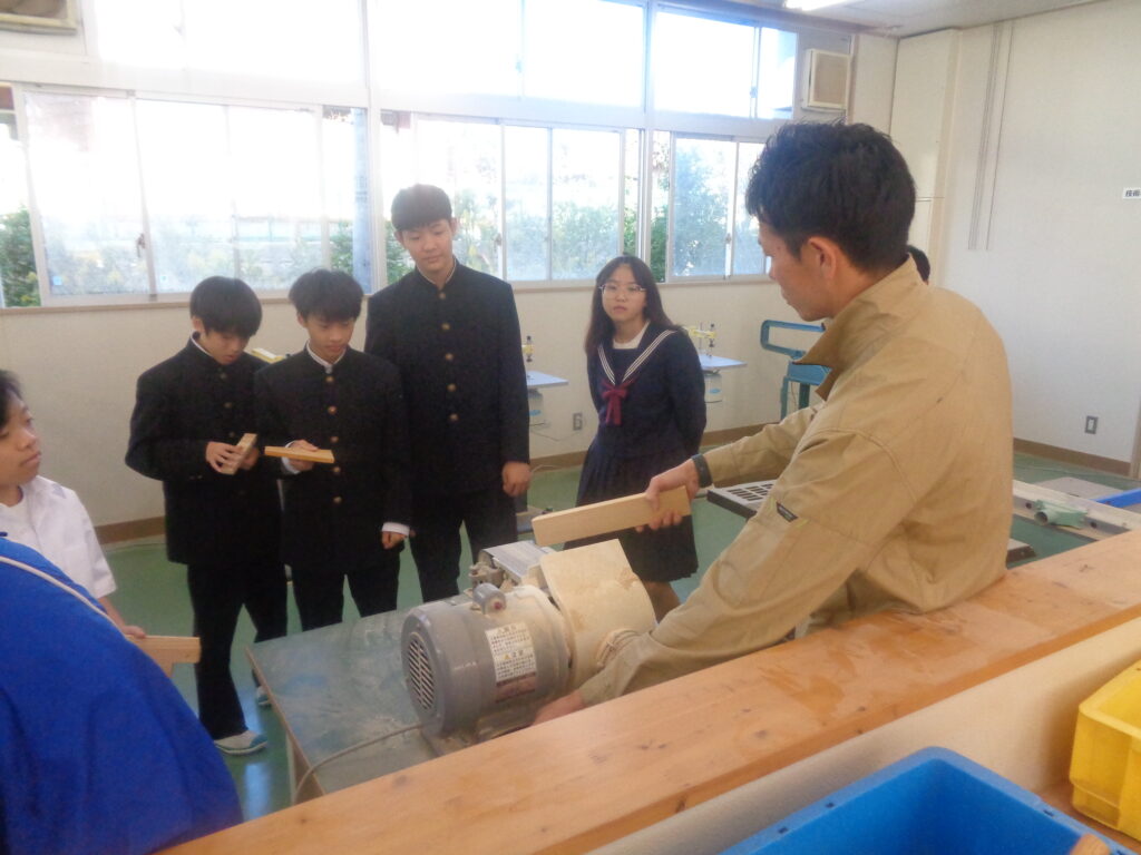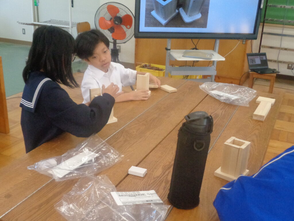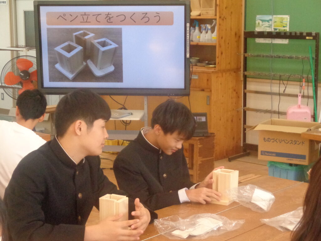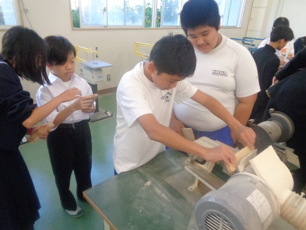 技術の授業で「ペン立てをつくろう」というテーマで木工制作に取り組みました。まず、電動糸のこぎりを使って木材を切り出し、形を整えました。次に、ベルトサンダーで面取りを行い、角をなめらかに仕上げました。少しずつ木の感触が変わっていくのを感じながら、完成に向けて一生懸命作業し、自分の手で形を作り上げていく楽しさ実感するとともに、道具の使い方や安全な作業手順についても学ぶことができました。