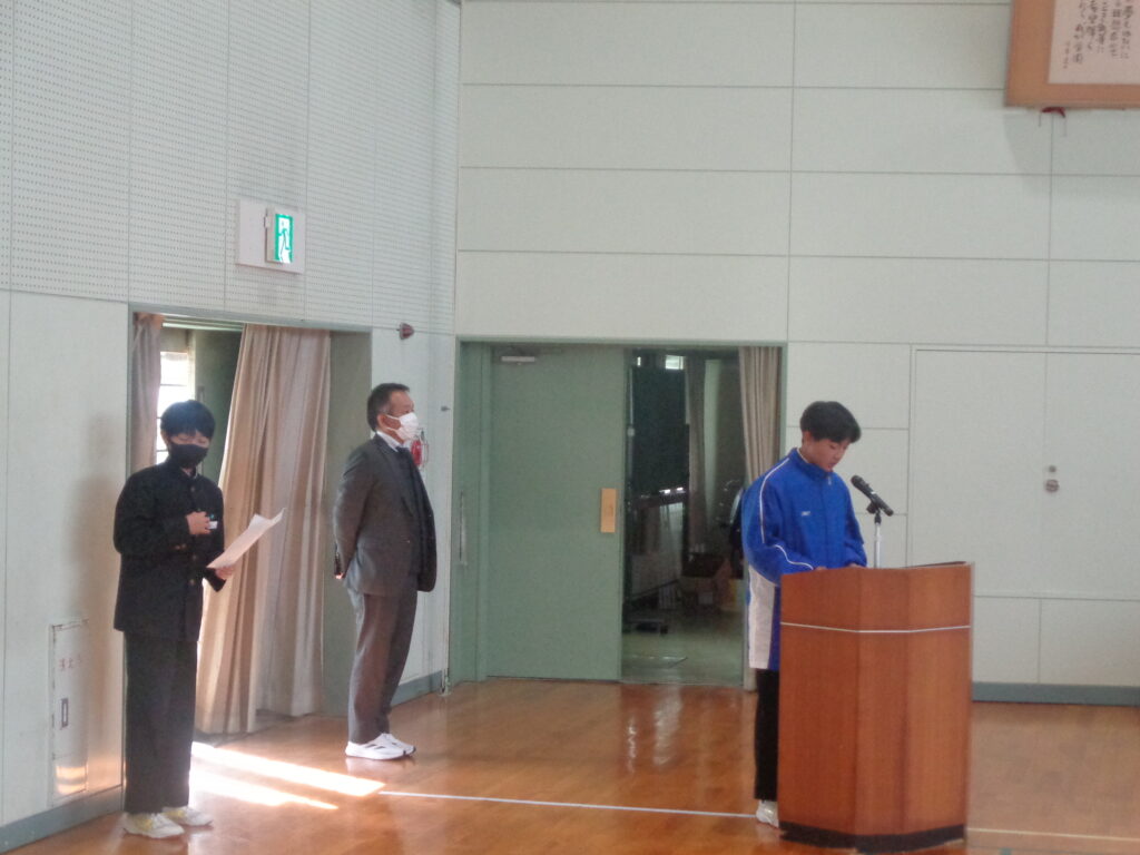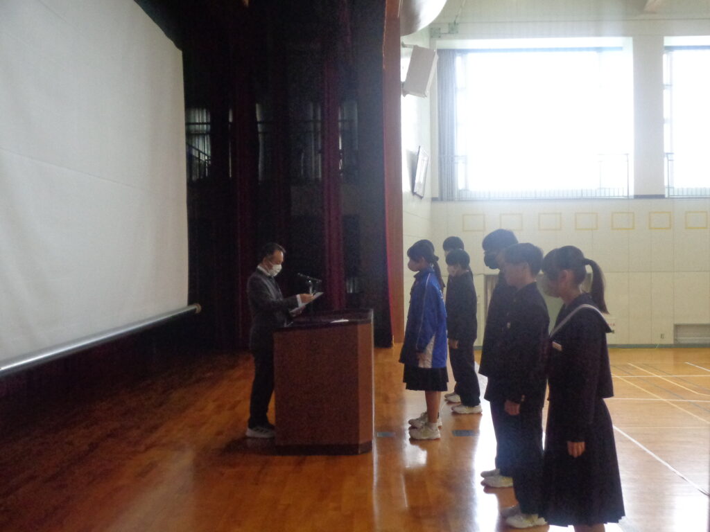 まず初めに、ソフトテニス部・陸上競技部の表彰伝達が行われました。表彰された生徒の皆さんおめでとうございます。