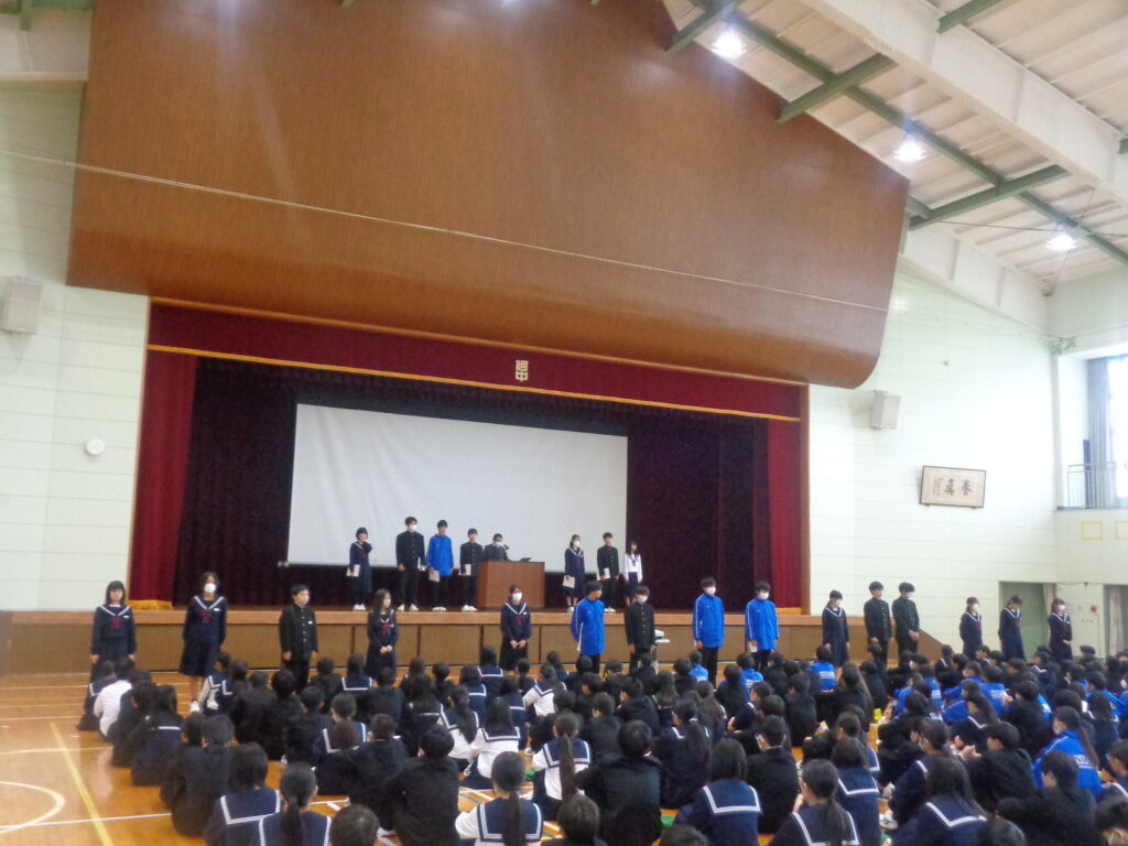 本日、3期テストが終了しました。テスト期間中、日頃の努力の成果を発揮しようと最後まで一生懸命取り組む姿が見られました。生徒の皆さん、お疲れ様でした。テスト後に全校集会を行いました。