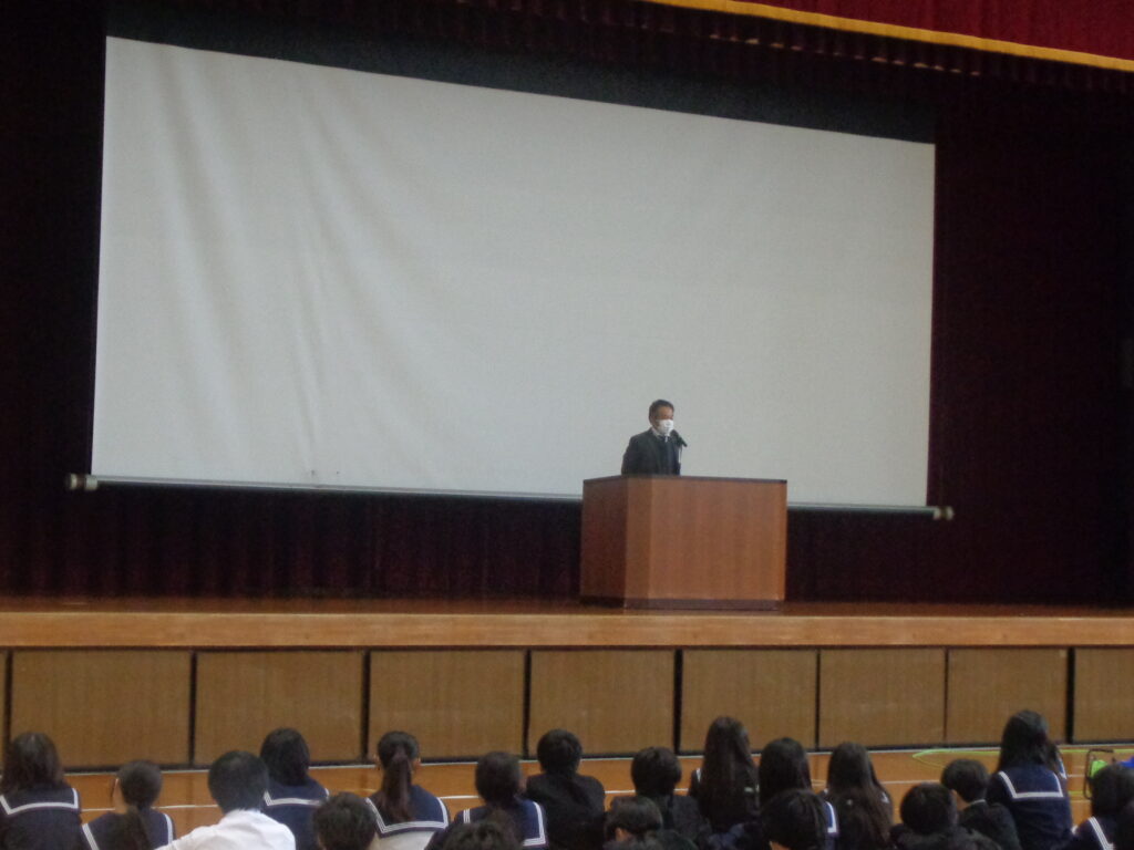 教頭先生からは、任命された生徒への激励と、規則とマナーについての話がありました。よく考えて行動し、自分も周りも気持ちよく生活できるようにしていきましょう。