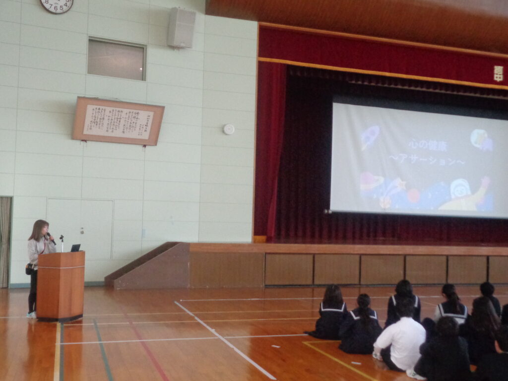 最後に、養護教諭より「心の健康」をテーマに「アサーション(自分も相手も大切にする伝え方)」についての話がありました。日々の人間関係をよりよいものにするためのコミュニケーション方法を学ぶことができました。