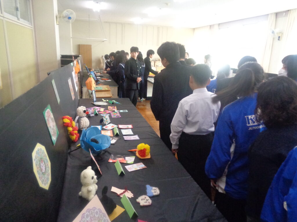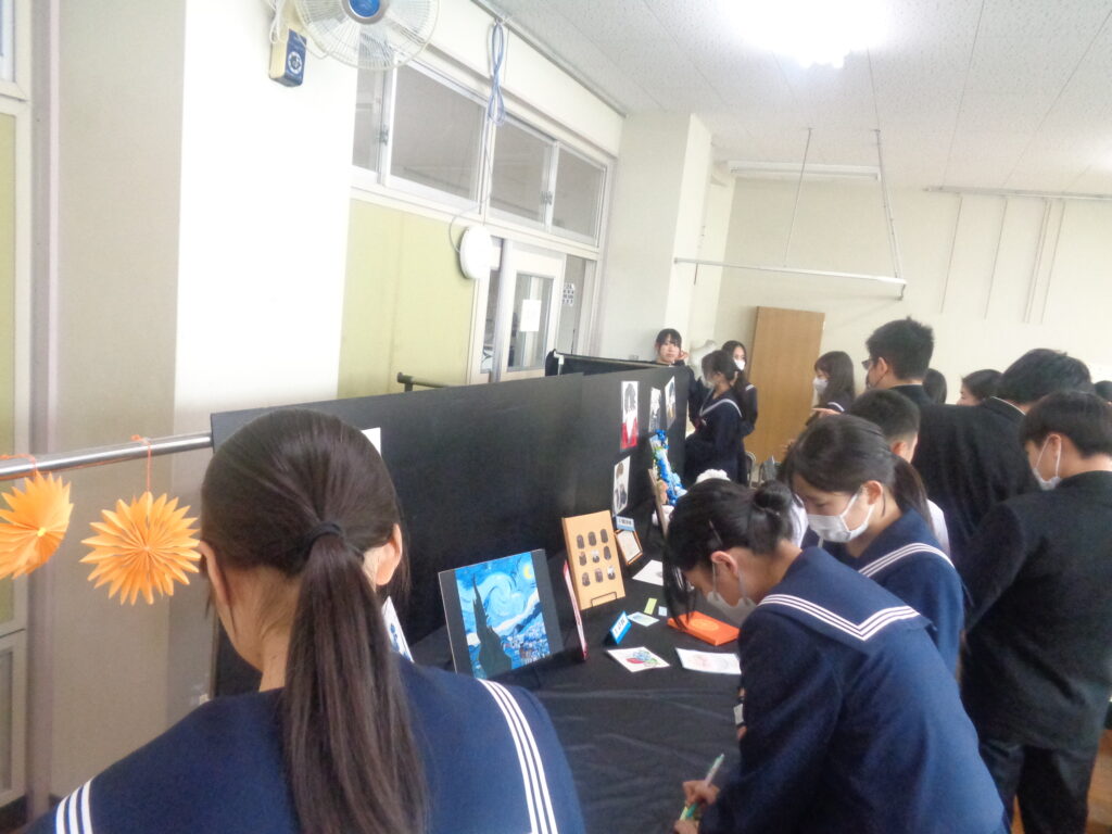 昼放課には多くの生徒が会場を訪れ、部員が心を込めて制作した作品を楽しそうに鑑賞していました。一つ一つの作品には、思いや工夫が丁寧に込められており、見る人の心を温かくしてくれます。懇談会中も作品展を開催しています。この機会にぜひご覧ください。
