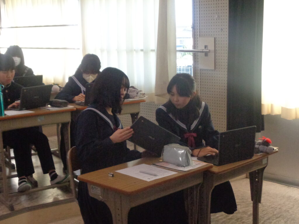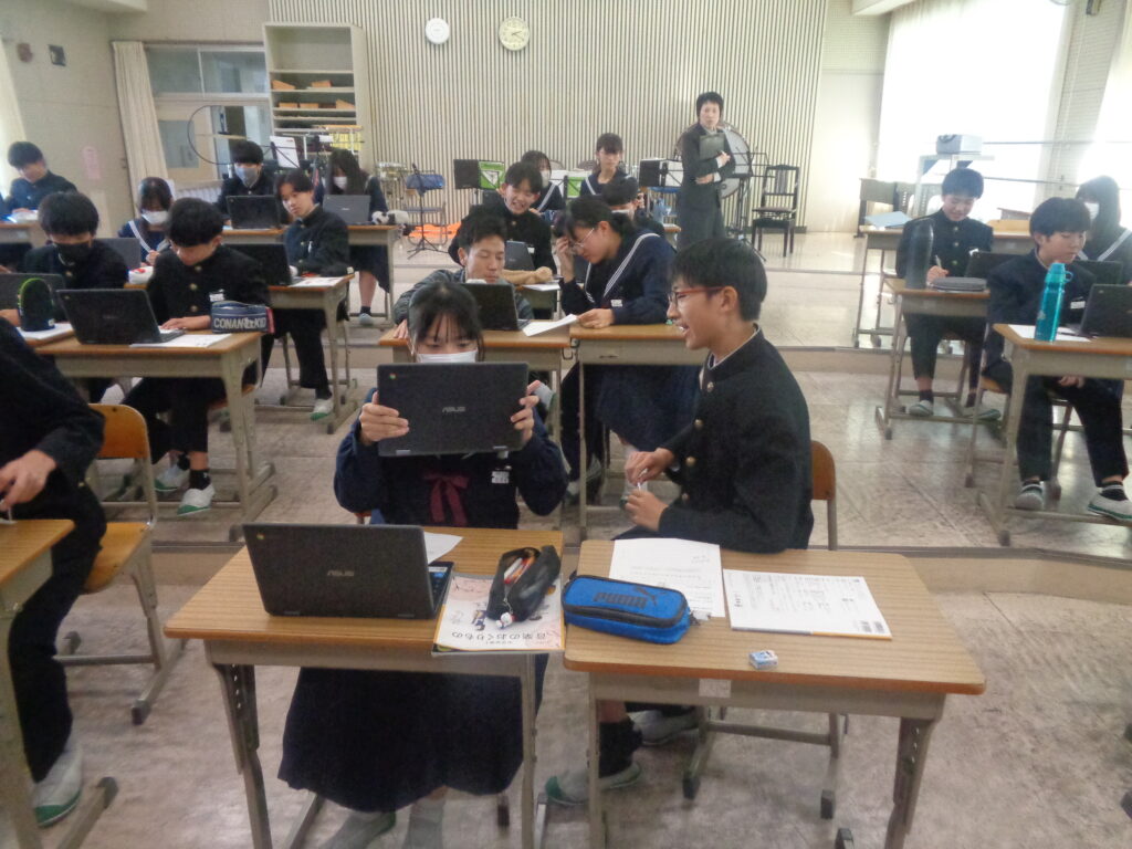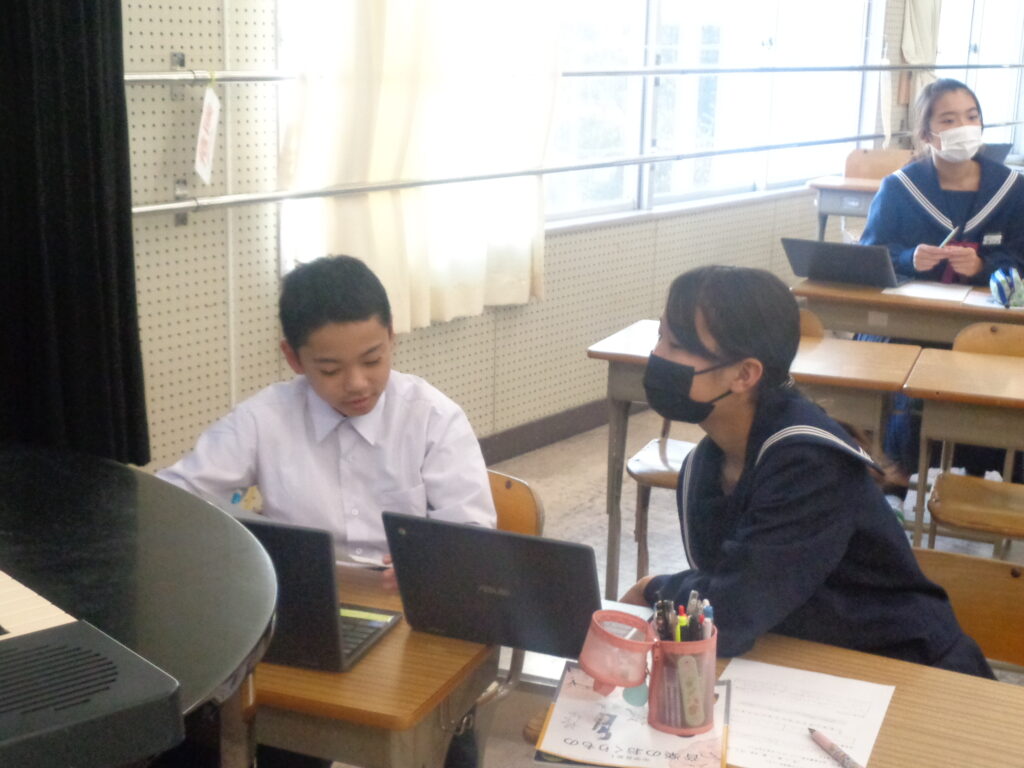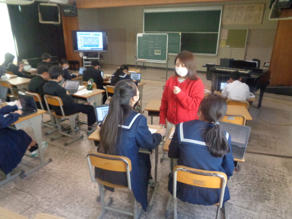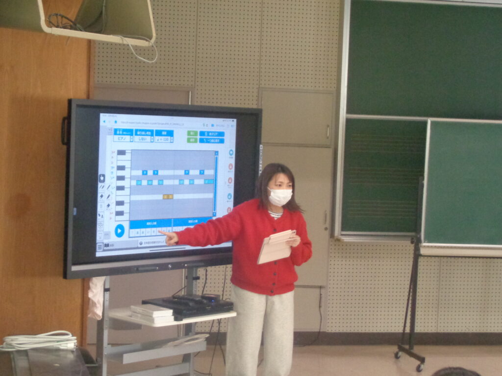 「冬の言葉を音にして、メロディを生み出そう」を学習課題に授業を行いました。子どもたちは、七五調のリズムを意識して冬を感じる言葉を考え、その言葉の抑揚を線で表しながら、「ミ・ソ・ラ」の音に当てはめてメロディづくりに取り組みました。完成したメロディについては、工夫したところを友達に発表し合い、互いの音楽を聴き合うことで、表現する楽しさや音楽のよさを感じることができました。