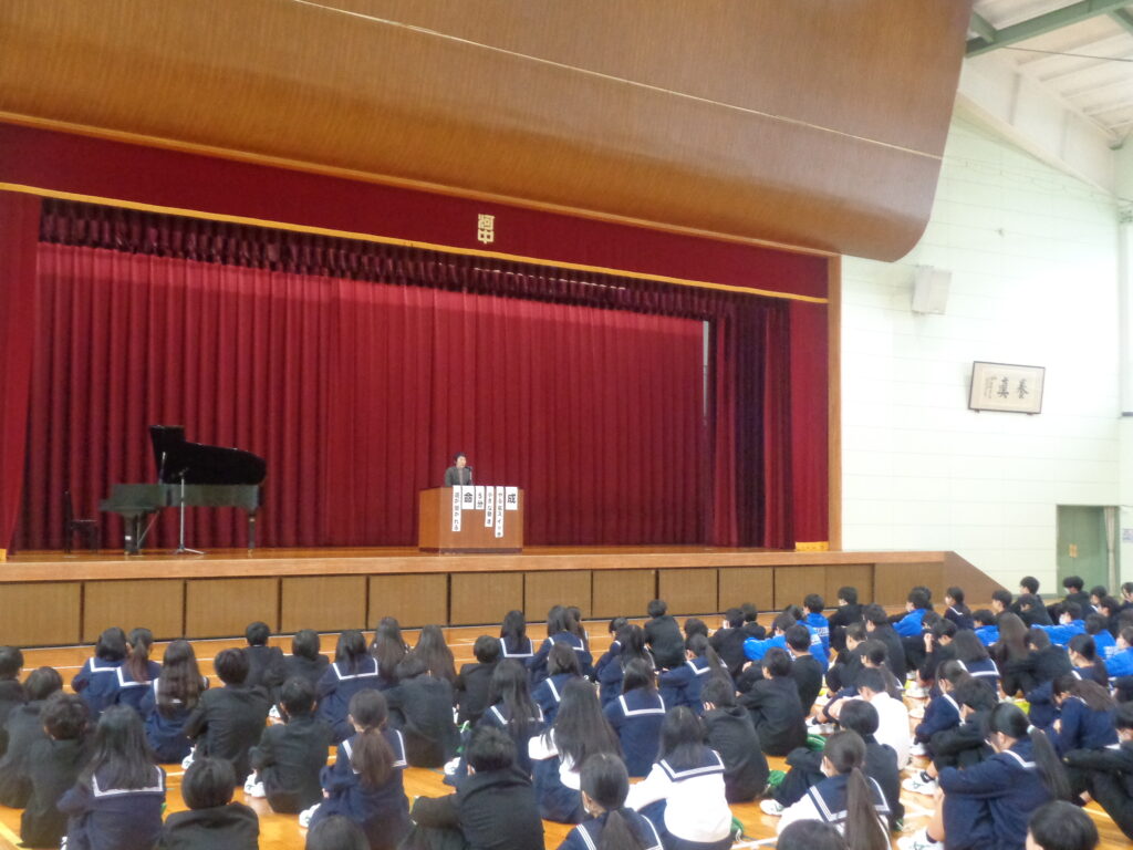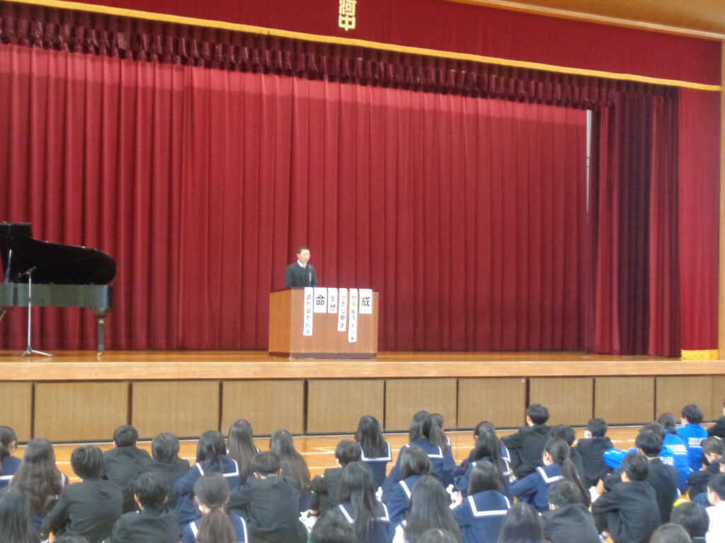 生徒指導主事からは、冬休みを安全で充実したものにするために「ふ・ゆ・や・す・み」を意識して生活することについての話がありました。①りかえり(2学期を振り返って今後に生かす) ②とりのある生活(早寝早起き、規則正しい生活)③くそく(交通安全・SNSの使い方)④すんで取り組む(目標をもってチャレンジする)⑤んな元気な姿で3学期始業式に会いましょう、という呼びかけがありました。