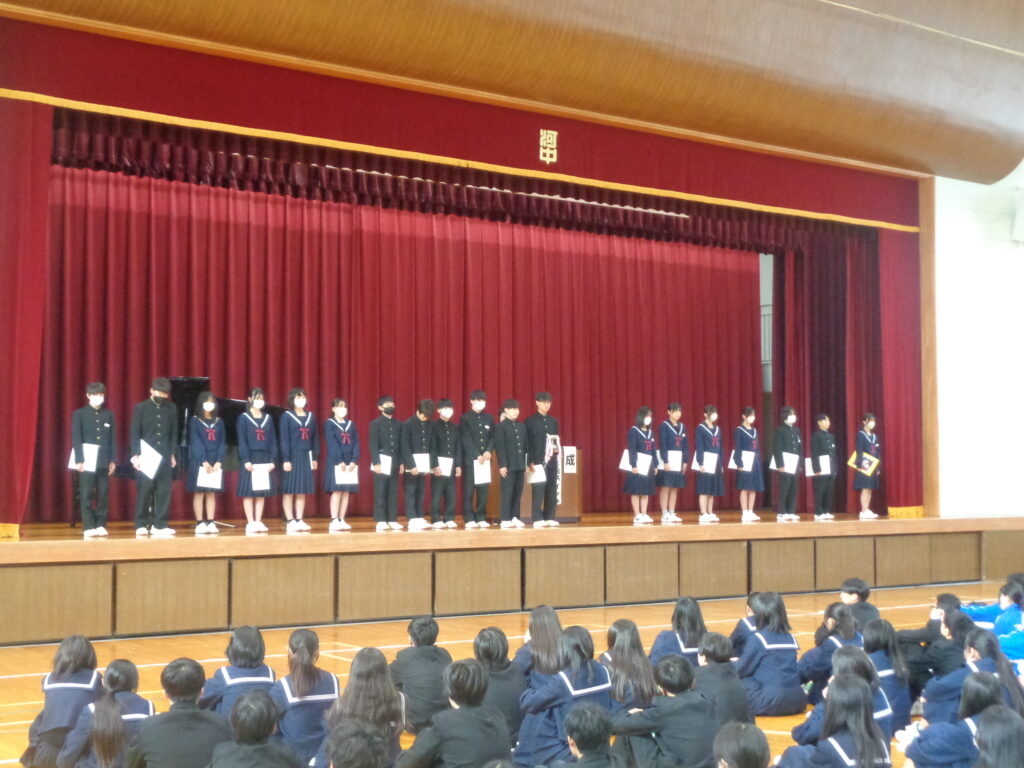 終業式後には表彰伝達が行われ「農のある風景(ポスター)、読書感想文、ソフトテニス部、サッカー部」の表彰が行われました。表彰された皆さん、おめでとうございます。
