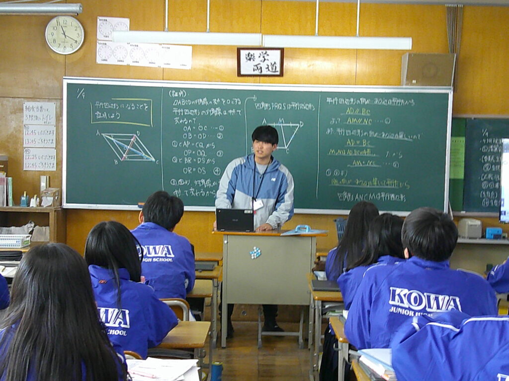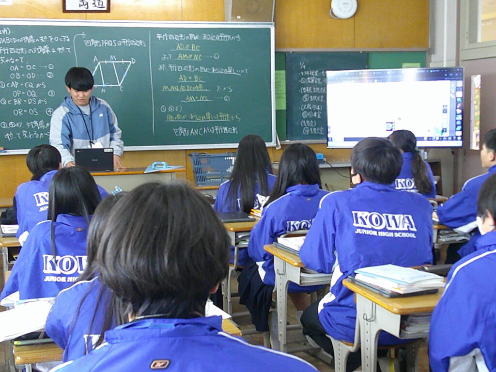 数学の証明の授業です。教師は、毎時間構成された板書を心がけています。ICT機器と両方を活用しながら、生徒の思考力・表現力を高めていきます。ちょうど授業の終わりに行ったので、びっしりとまとまった板書を見ることができました。これを見ることで、子どもたちの頭の中はすっきりと整理されていきます。