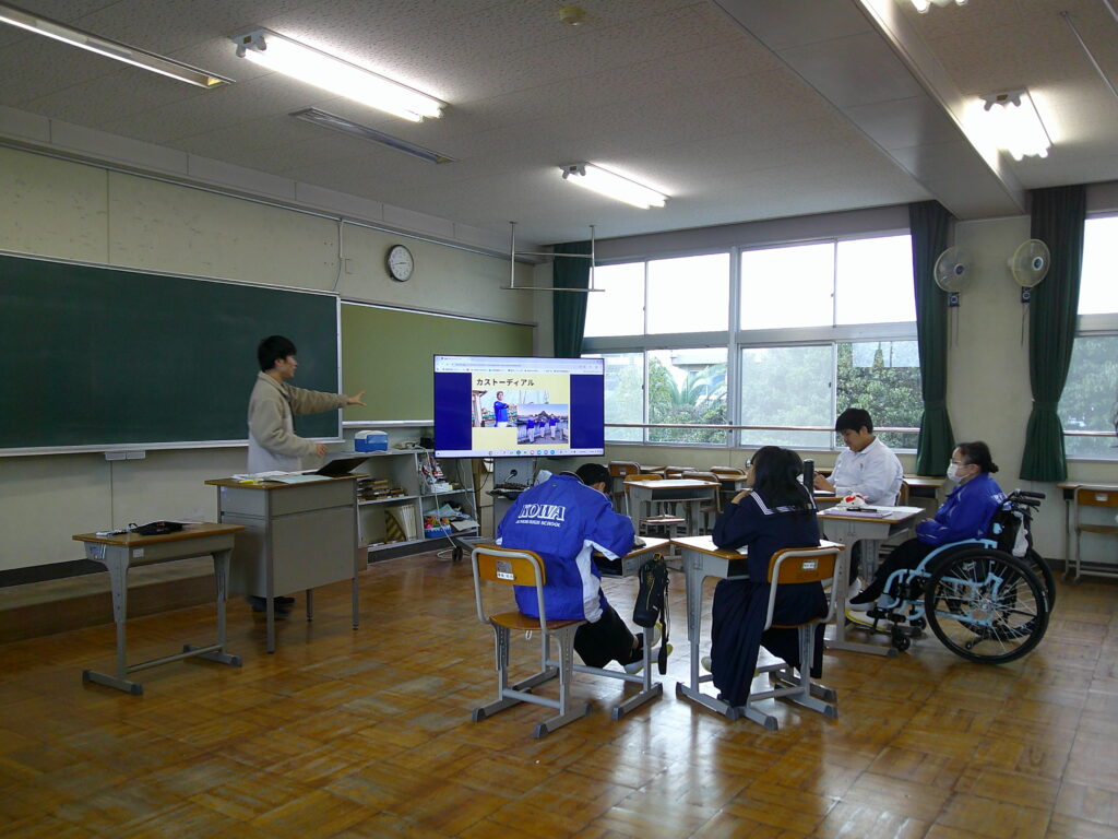 カストーディアルについて話し合っていました。「何のために、誰のためにするのか」という発問に対して、「みんなが楽しむため」と答えていました。「みんなには、来てくれた人だけではなく、働く人も含む」という追加の説明もあり、自分だけでなく周りの人にまで目を向けた発言に成長を感じました。とてもよい雰囲気の中で、授業が展開されていました。