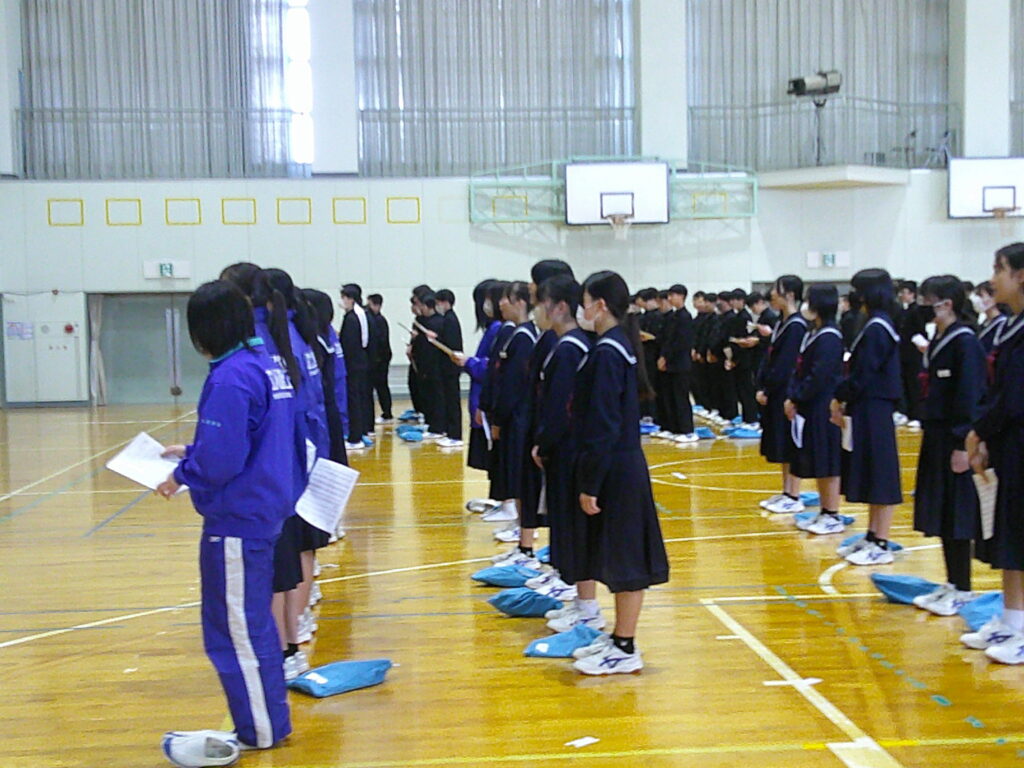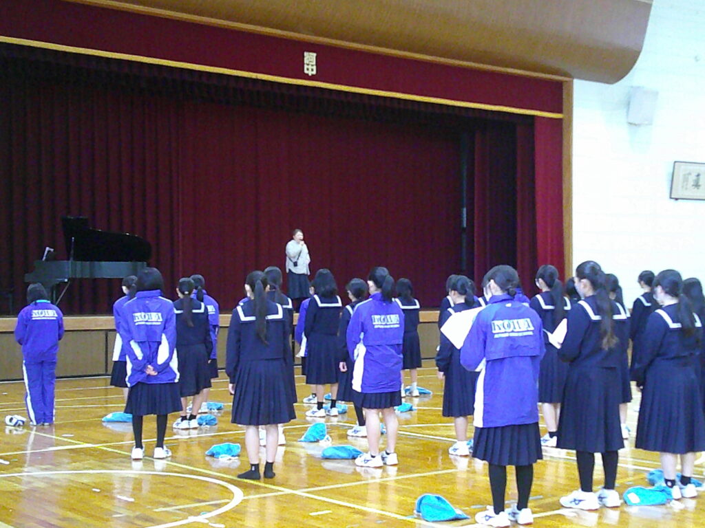 体育館では、卒業式に向けての歌練習が始まっていました。歌詞の意味を確認しながら、フレーズごとに歌っていきます。練習すればするほど、だんだん上手くなっていくのが分かりました。この歌に自分の想いを乗せて、すばらしい式にしましょう。