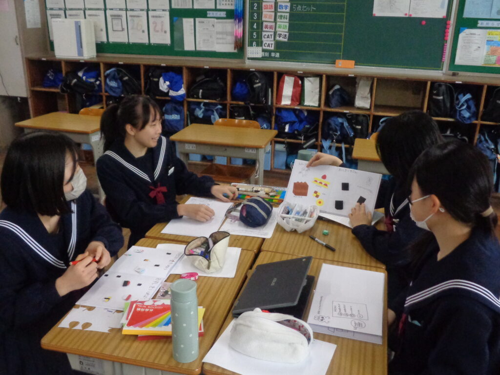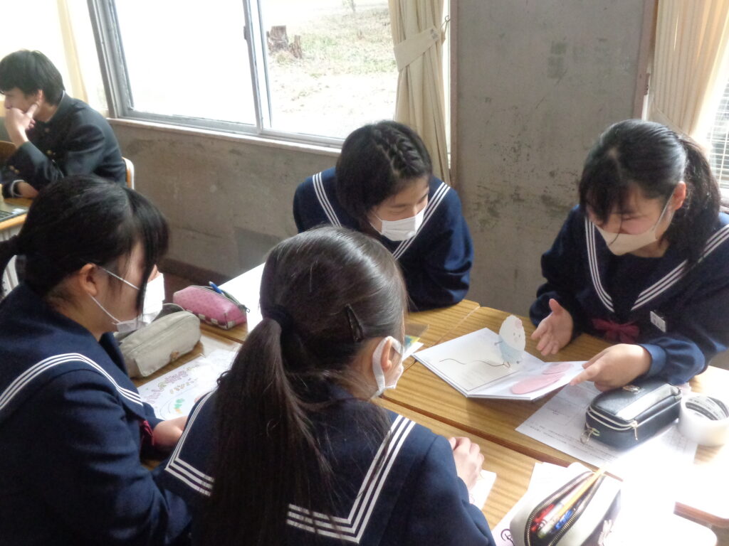 家庭科の授業で絵本作りに取り組みました。完成した作品をグループで読み聞かせを行いました。絵や文章、構成にそれぞれのアイデアが生かされていました。