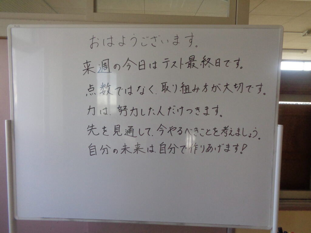 今週からテスト週間(1・2年)が始まりました。学年主任からの温かいメッセージがホワイトボードに書かれ、生徒たちを励ましています。土日も計画的に学習に取り組み、来週の本番に向けて、力を発揮してほしいと思います。