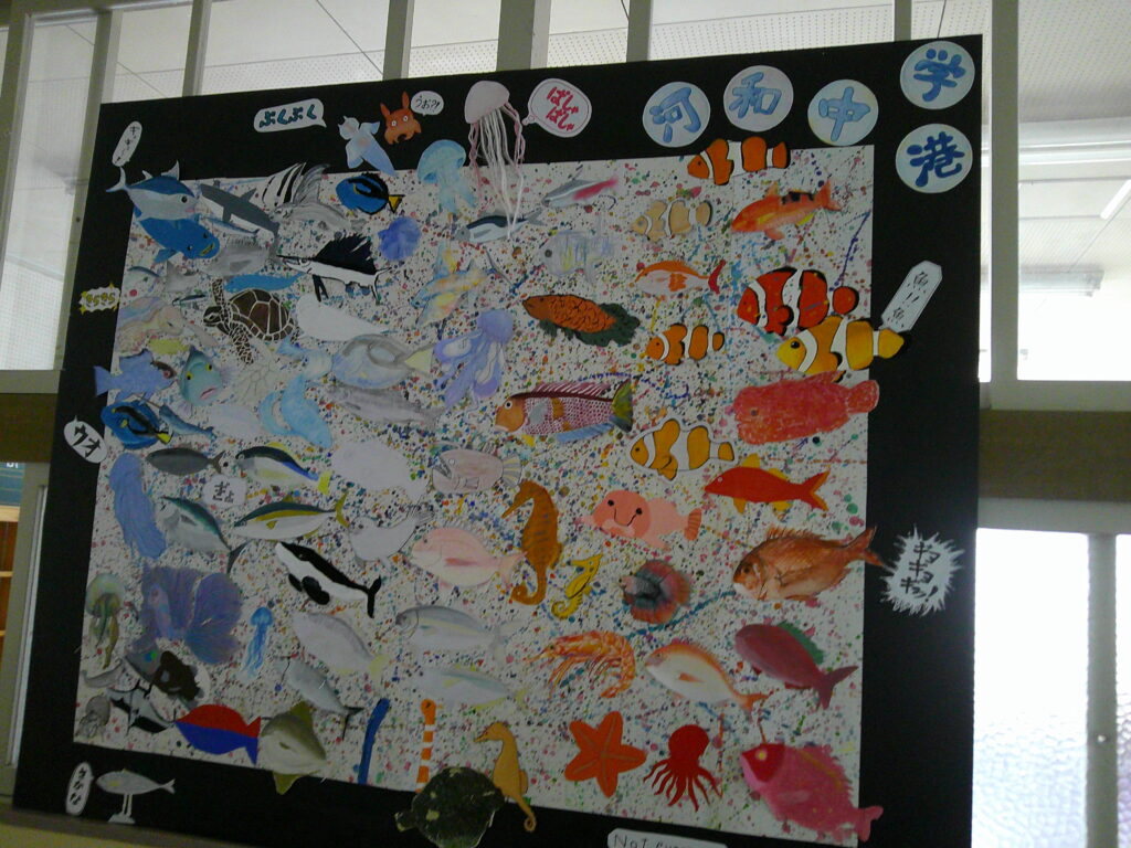 卒業制作が完成し、廊下に掲示されていました。海の生き物を一人一人が表現しています。近づいてみると、それぞれの生き物に違いがあり、よさがあります。