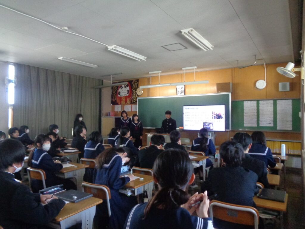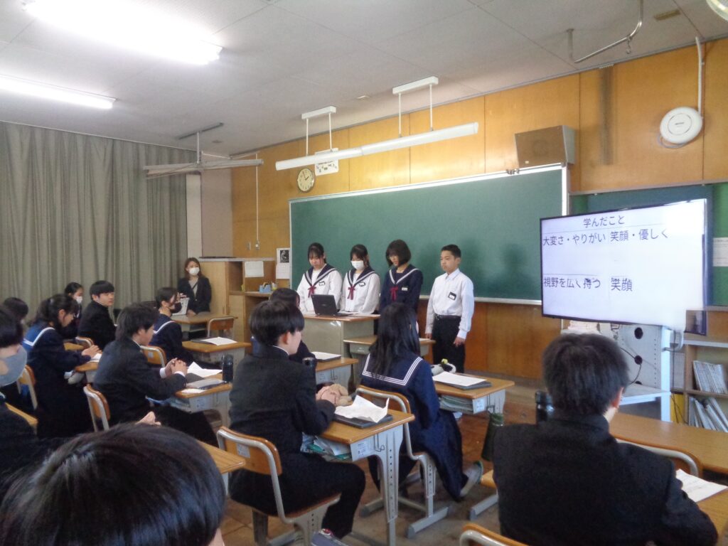 本日、1・2年生の学校公開日を実施しました。1年生は職場体験学習の発表を行い、体験を通して学んだことを伝えることができました。2年生は進路説明会を行い、これからの進路選択について理解を深める機会となりました。本年度も保護者の皆様には、本校の教育活動に温かいご理解とご協力をいただき、心より感謝申し上げます。今後ともどうぞよろしくお願いいたします。
