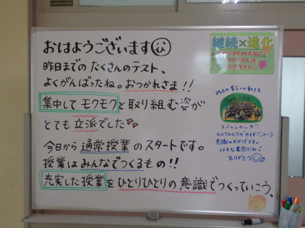 朝のホワイトボードや黒板には、学年主任や担任からの温かいメッセージが書かれ、子どもたちを迎えました。新しい一日の始まりに、励ましや思いやりの言葉が添えられることで、子どもたちは安心して授業に向かえると思います。これからの学校生活の中で、一人一人が自分らしく力を発揮し、仲間とともに成長していけることを願っています。