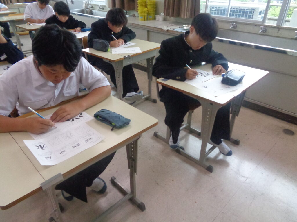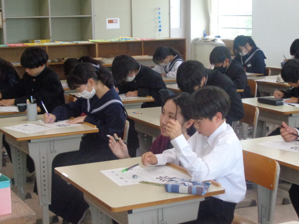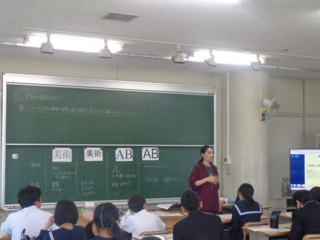 本校では、「見通し」と「課題設定」を工夫し、生徒の主体性を高める授業を行っています。どの生徒も「絵文字」の制作に向けてレタリングに生き生き取り組んでいました。美術の授業を通して「表現する。創造する。」楽しさを味わってほしいと思います。