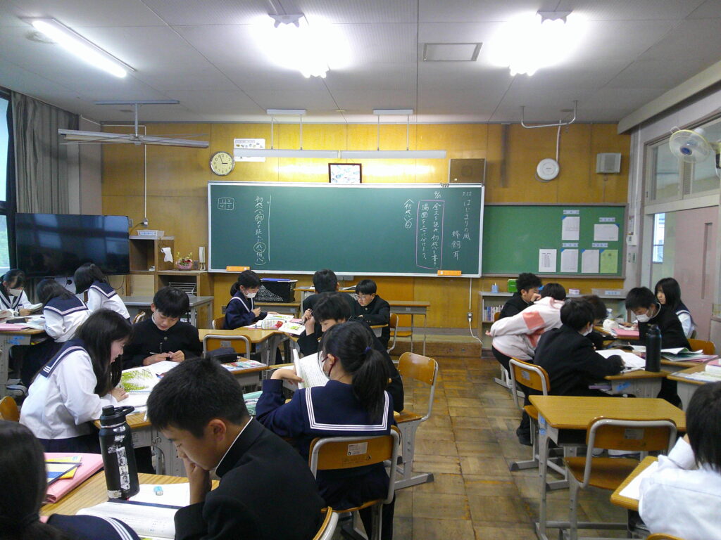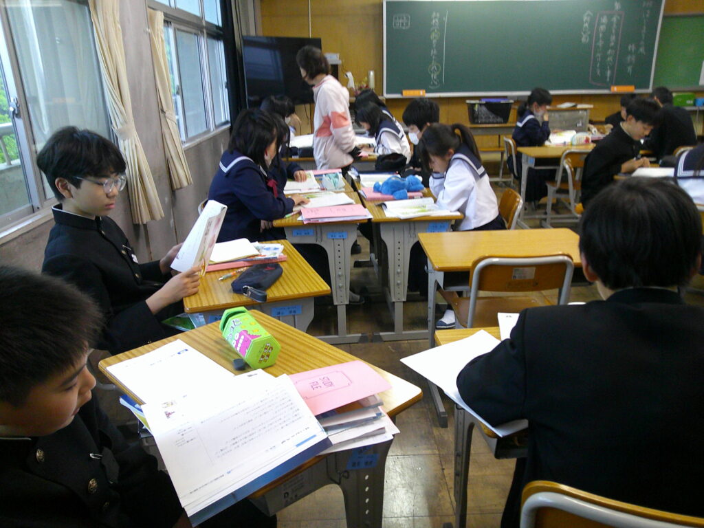 国語の授業です。グループで交代しながら読んでいました。教室から声が聞こえるっていいものです。真剣に読む場面あり、聞く場面ありで、よい雰囲気なのかで進められていました。