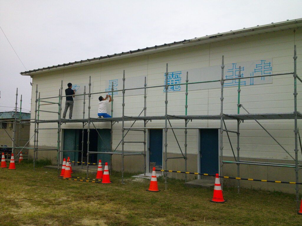 「賢く 逞しく 麗しく」の文字の復活を目指して、4日に足場を組んでいただきました。19日には文字を書き入れます。 昨日から、その日のための準備に取りかかっています。文字が書きやすいように、下地が汚れないようにとマスキングテープを貼っています。二人とも職人魂があるようです。ありがとうございます。