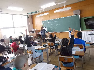 3年生は算数で、「▢mの3倍が12m」のように、基になる数がわからないときの解き方を考えました。これまでに学習したことを思い出しながら、たくさんの子が手を挙げて発表していました。
