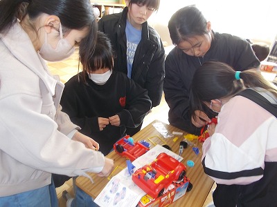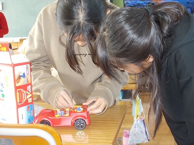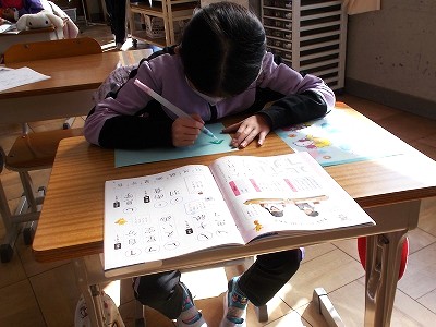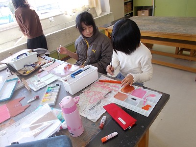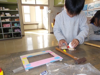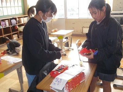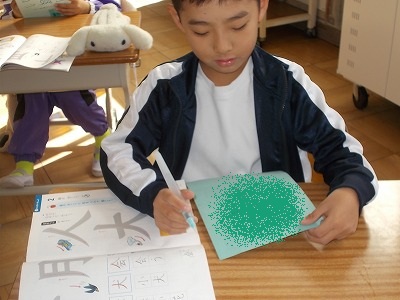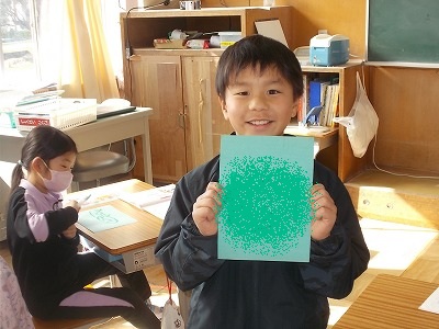 1年生は図工で「おって たてたら」の作品を作っていました。違う色を2枚貼り付けて裏表で色を変えてみたり、かごに持ち手をつけてみたり・・・。工夫がいっぱいの楽しい作品ばかりでした。後ろの掲示板には、子どもたちが作ったサンタさんもいました。